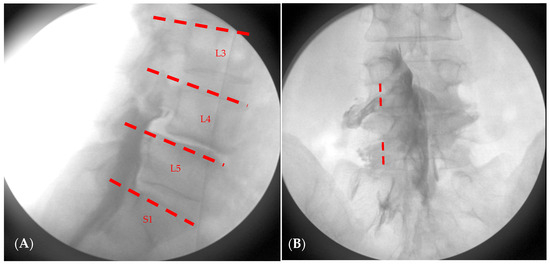 Schematic drawing for analysis of the level of epidural contrast spread in (A) and nerve root spread in (B). In (A), the dotted line indicates the range of epidural spread level. L3, includes the level above the upper margin of L4; L4 includes the level above the upper margin of L5; L5 includes the level between the upper margin of L5 and the L5-S1 intervertebral space; S1 includes the level between the upper margin of S1. In (B), the dotted line is in line with the center of pedicle. And if contrast crosses the line, it means nerve root spreading at that level. In this patient, the contrast medium reached L4 and spread to two nerve roots.