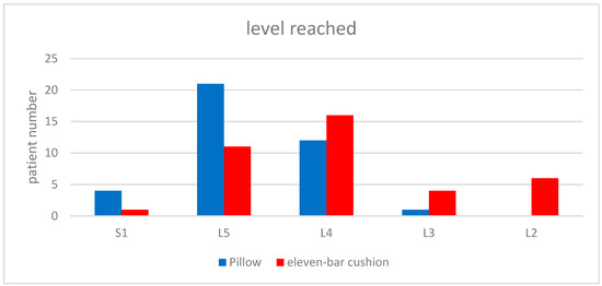 On the Mann–Whitney U tests, the eleven-bar group demonstrated a significantly higher cephalic spread of contrast than the pillow group (the median highest dye level is four versus five; p < 0.001), while the number of nerve root opacification and VAS changes did not differ between groups (Table 2). For clinical interpretability, we additionally evaluated the proportion of patients whose contrast spread reached L3 or higher. This proportion was significantly greater in the eleven-bar group (10/38, 26.3%) than in the pillow group (1/38 and 2.6%; p = 0.0067, Fisher’s exact test) (Figure 6). In the ordinal logistic regression, the eleven-bar group showed a markedly increased likelihood of achieving higher cephalad levels (OR = 0.194), whereas prior lumbar surgery (OR = 4.245) and having both low back pain and radiating pain (OR = 0.063) were also significant predictors of dye spread pattern (Table 3). In contrast, Poisson regression demonstrated that age was the only variable associated with the number of nerve roots reached, with each 1-year increase associated with a 2% reduction in root opacification (IRR = 0.98; p = 0.003). Group, surgical history, and symptom category were not significant (Table 4).