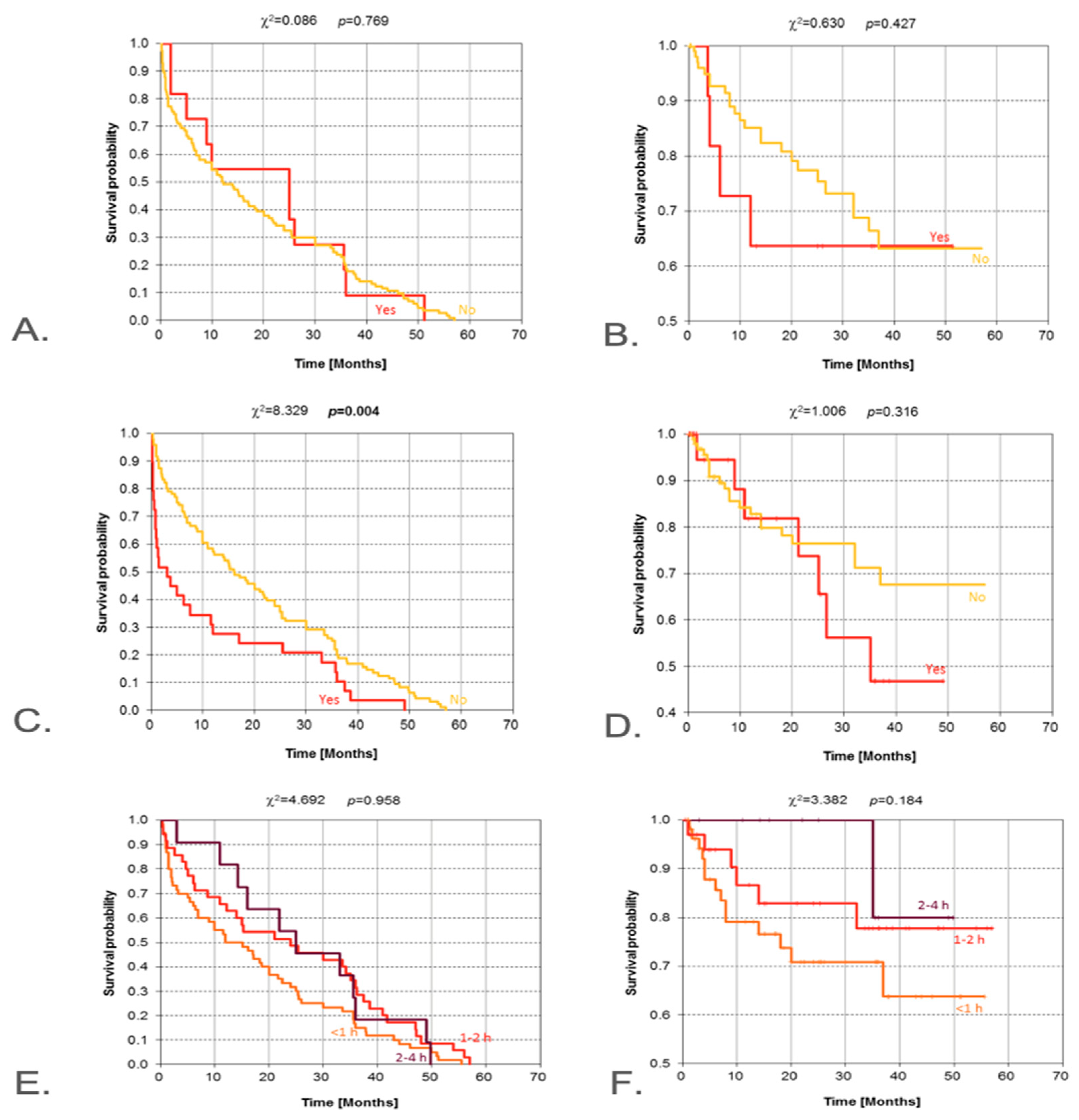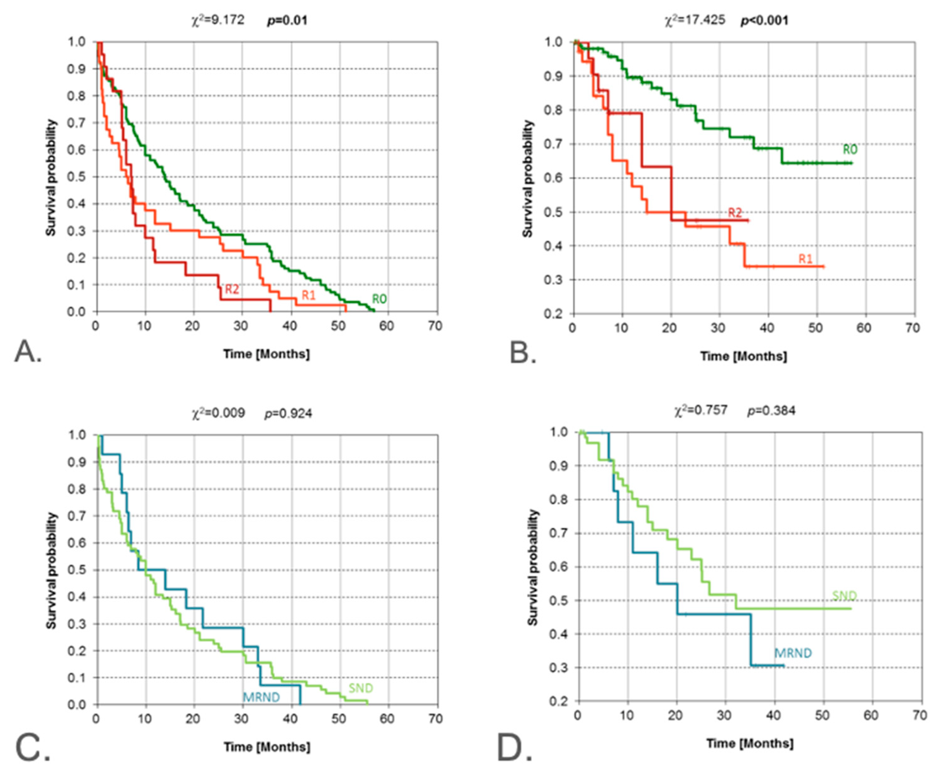 | Resection margins | R0 vs. R1/R2 (positive) | χ2 | 0.010 | <0.001 | R0 strongly favorable for OS |
