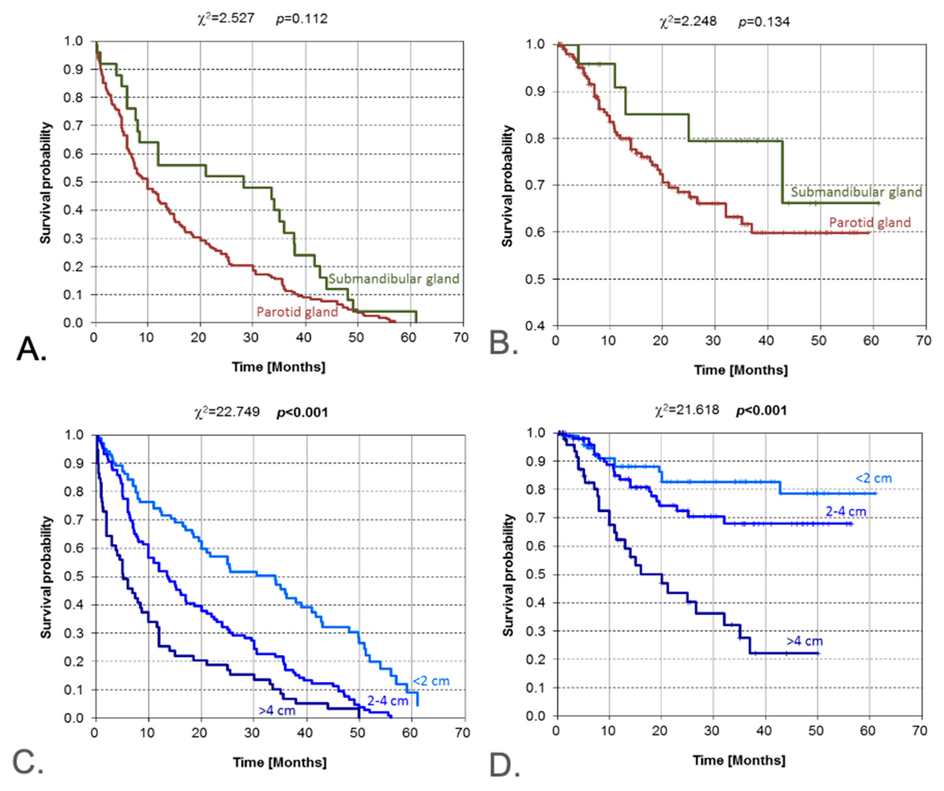 | Tumor size (diameter) | Ordinal increase | Log-rank/χ2 | <0.001 | <0.001 | Monotonic worsening with larger size |