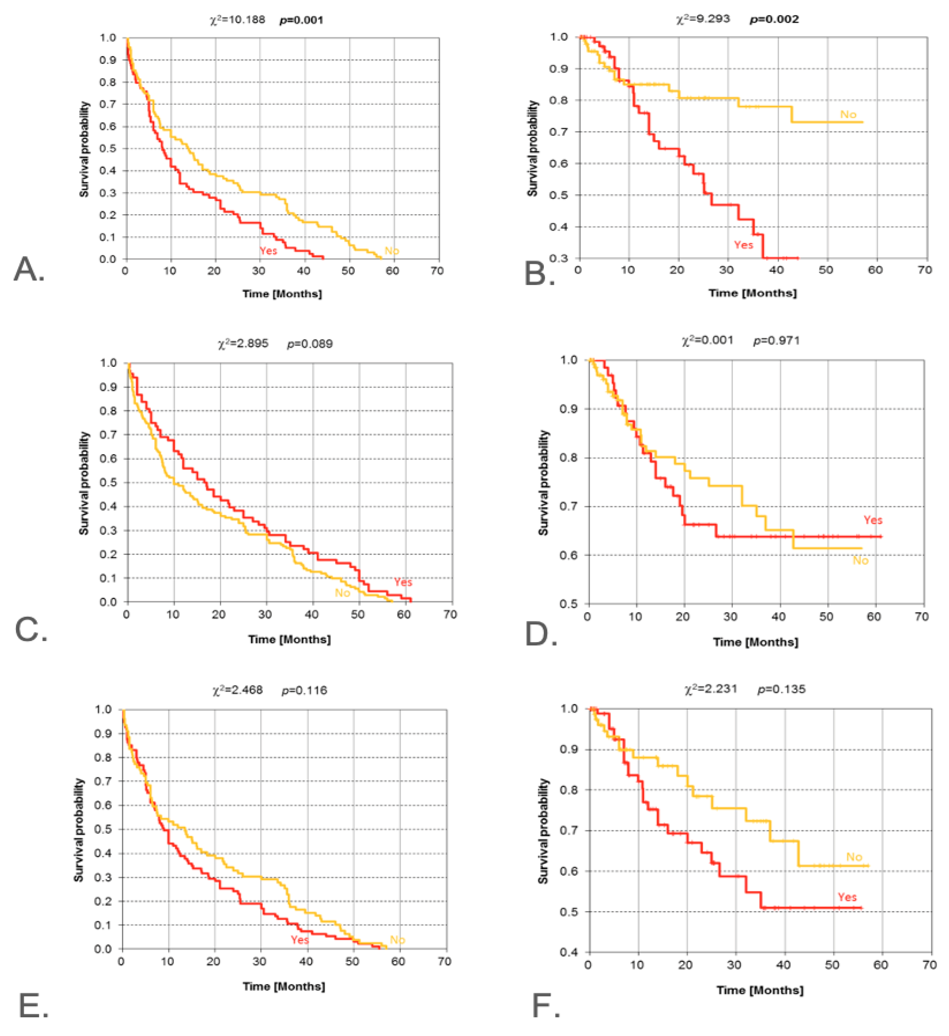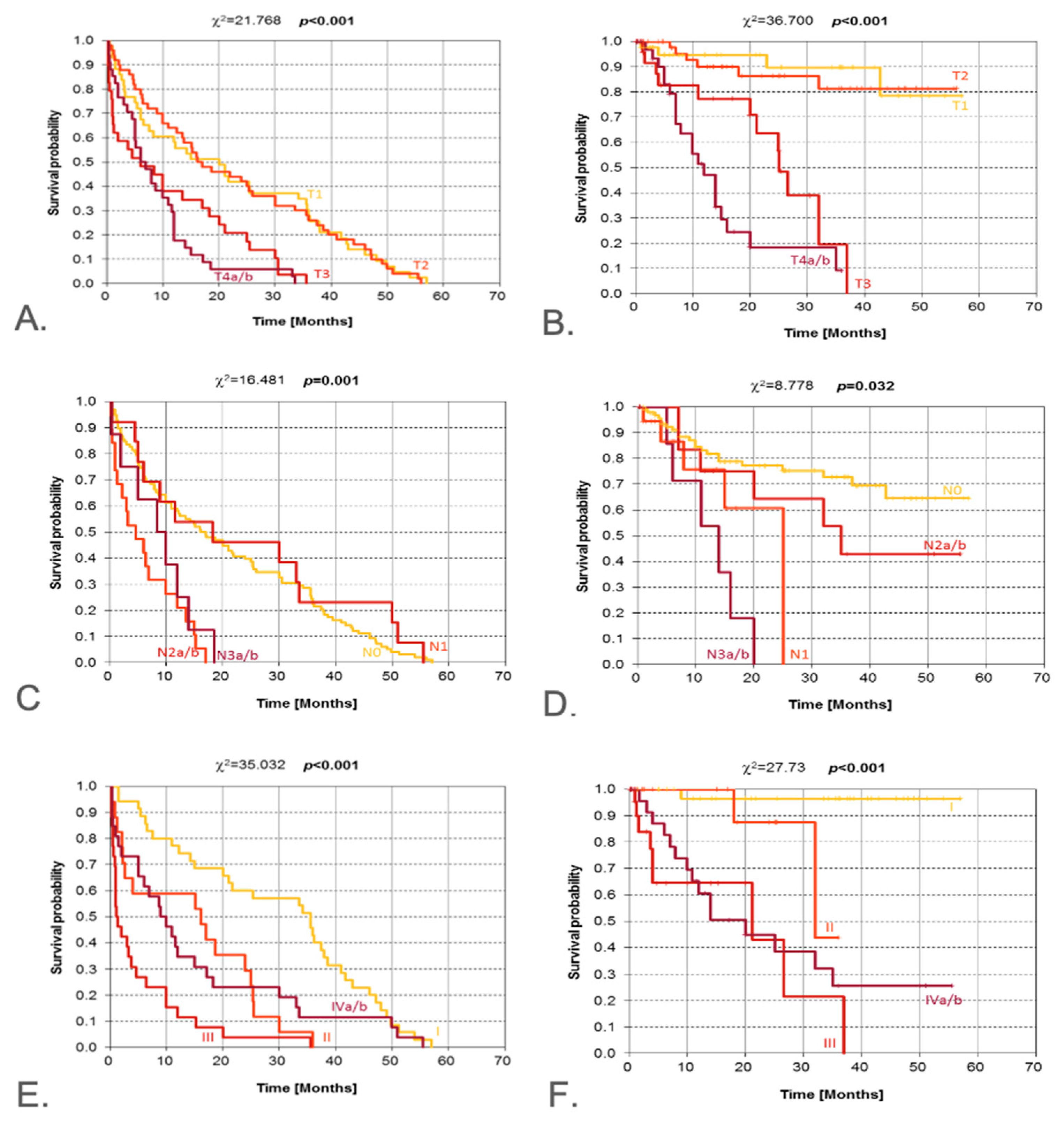 | Pathological N (pN) | N0–N3 | χ2 | 0.001 | 0.032 | Nodal involvement worsens outcomes |