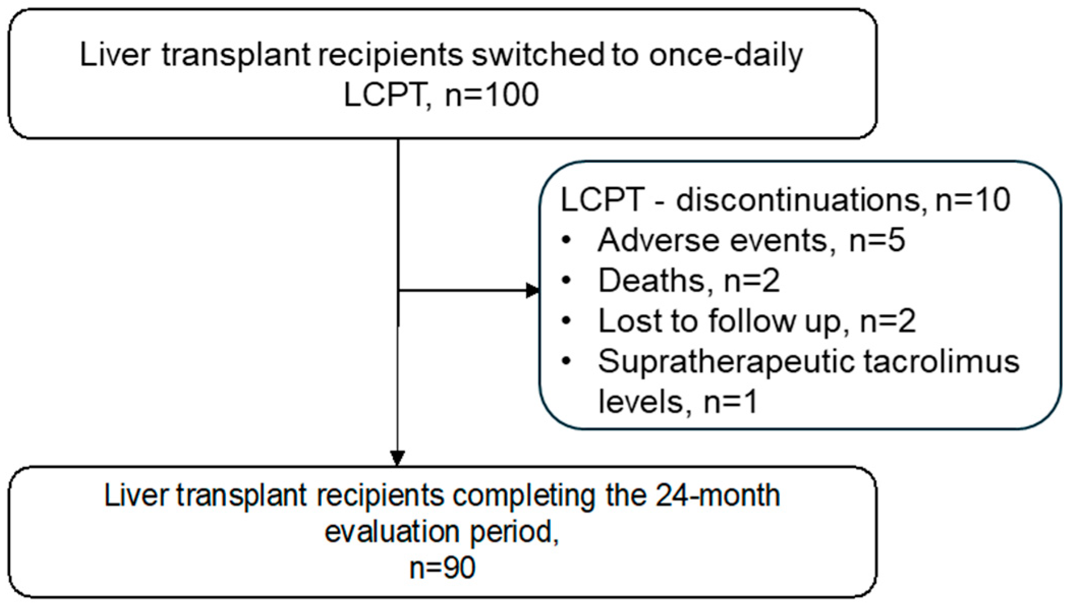 - Soliman, T.; Gyoeri, G.; Salat, A.; Mejzlík, V.; Berlakovich, G. A Multi-Centre Non-Interventional Study to Assess the Tolerability and Effectiveness of Extended-Release Tacrolimus (LCPT) in De Novo Liver Transplant Patients. J. Clin. Med. 2023, 12, 2537. [Google Scholar] [CrossRef]