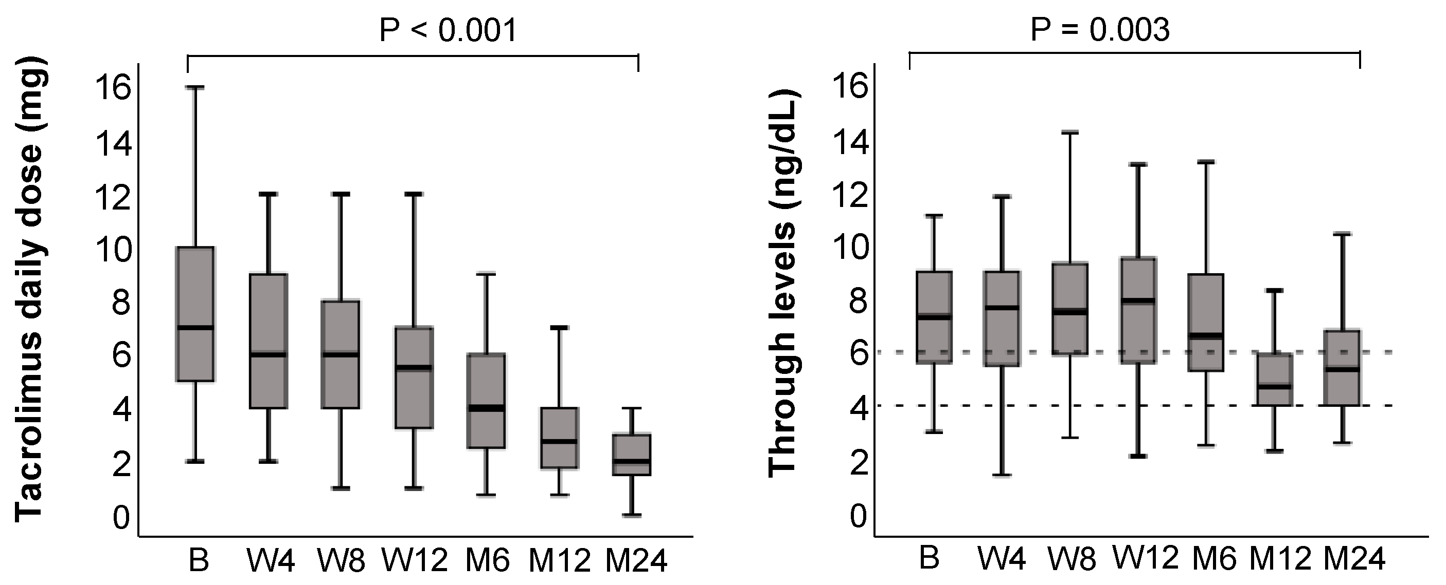 - Considine, A.; Tredger, J.M.; Heneghan, M.; Agarwal, K.; Samyn, M.; Heaton, N.D.; O’Grady, J.G.; Aluvihare, V.R. Performance of modified-release tacrolimus after conversion in liver transplant patients indicates potentially favorable outcomes in selected cohorts. Liver Transplant. 2015, 21, 29–37. [Google Scholar] [CrossRef] [PubMed]