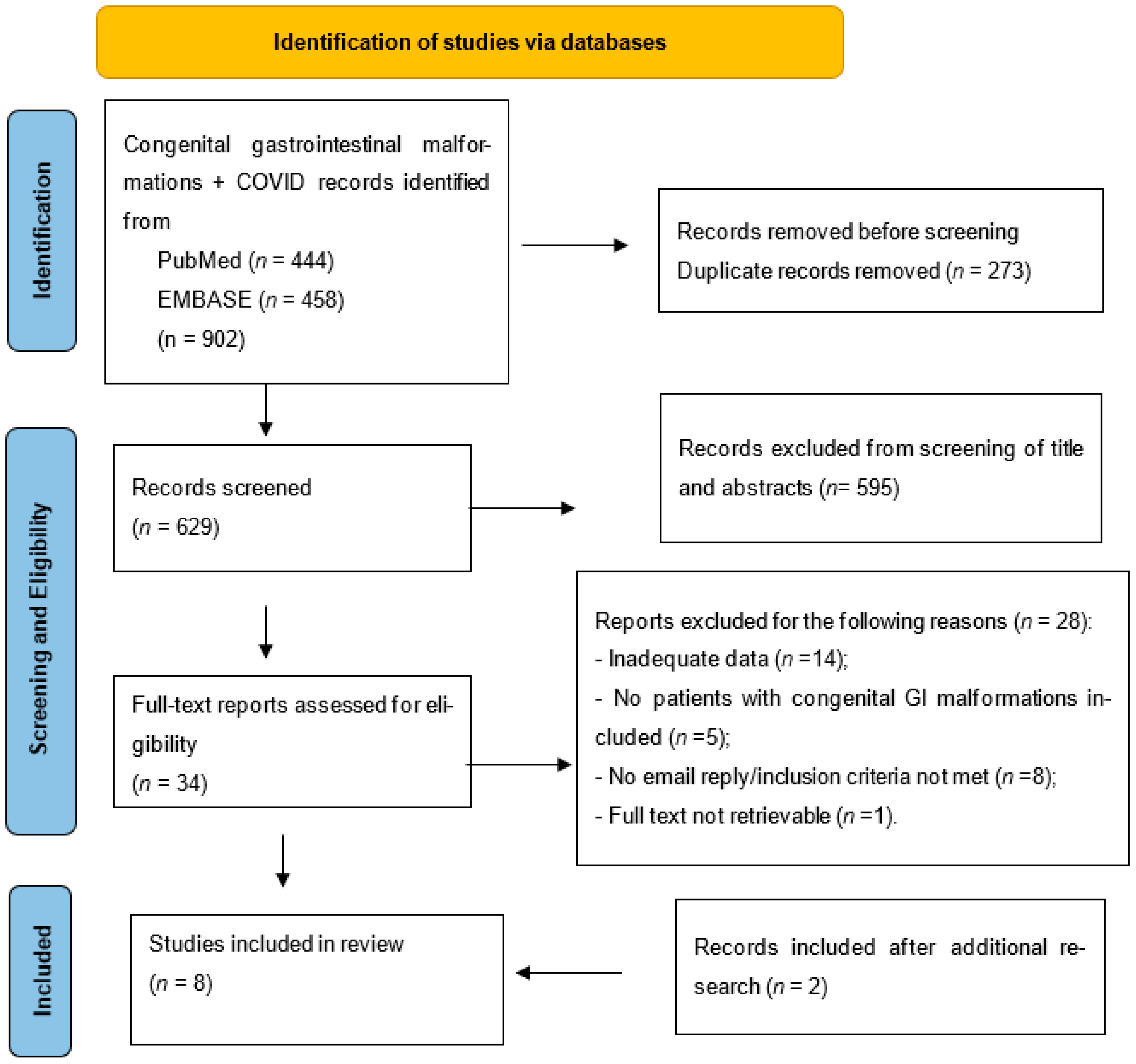 Chicago/Turabian StyleStratulat-Chiriac, Iulia, Elena Țarcă, Raluca Ozana Chistol, Ioana-Alina Halip, Viorel Țarcă, and Cristina Furnică. 2025. "Association Between Congenital Gastrointestinal Malformation Outcome and Largely Asymptomatic SARS-CoV-2 Infection in Pediatric Patients—A Systematic Review" Journal of Clinical Medicine 14, no. 23: 8533. https://doi.org/10.3390/jcm14238533
