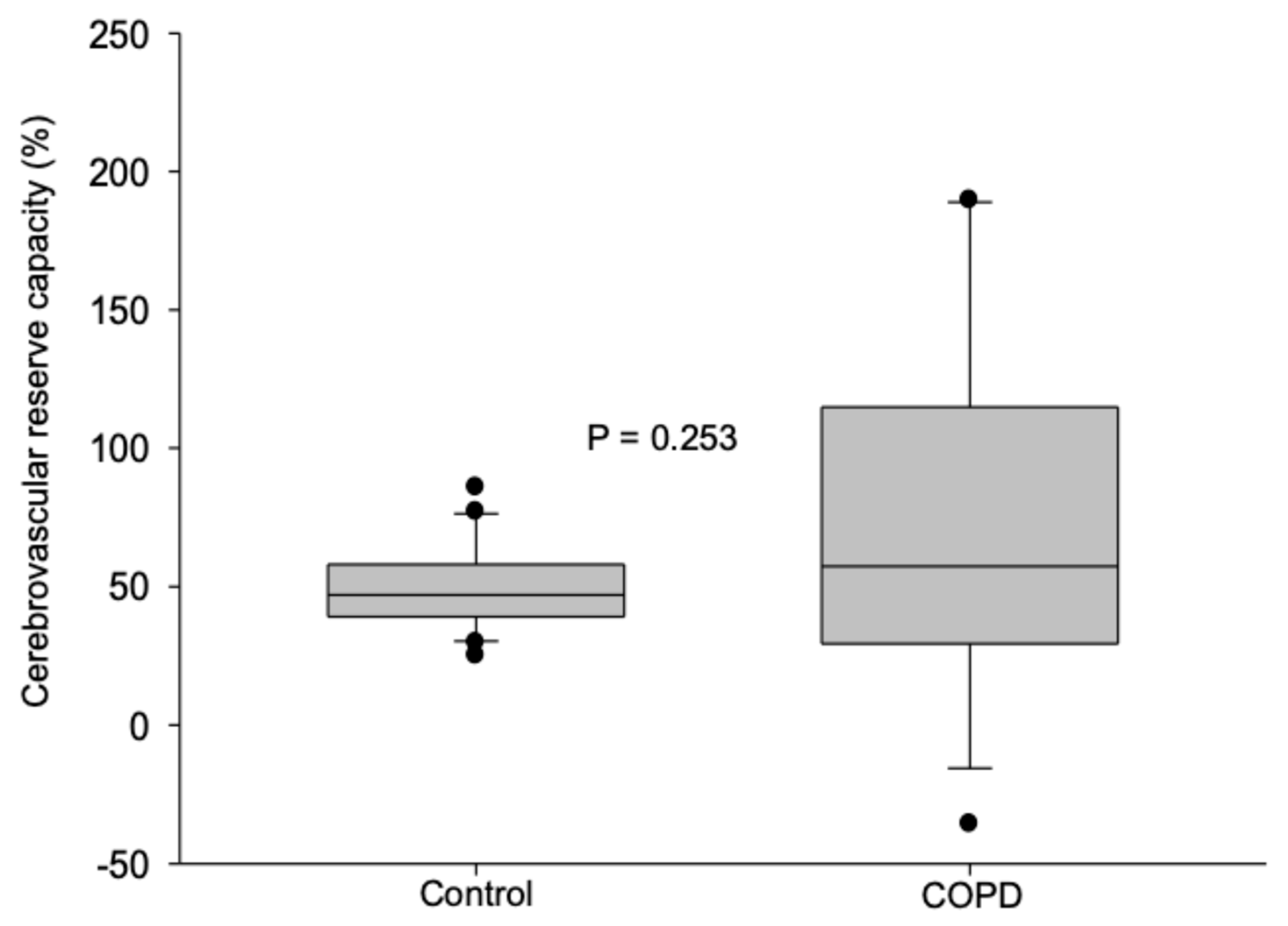 - Hlavati, M.; Buljan, K.; Tomić, S.; Horvat, M.; Butković-Soldo, S. Impaired cerebrovascular reactivity in chronic obstructive pulmonary disease. Acta Neurol. Belg. 2019, 119, 567–575. [Google Scholar] [CrossRef] [PubMed]