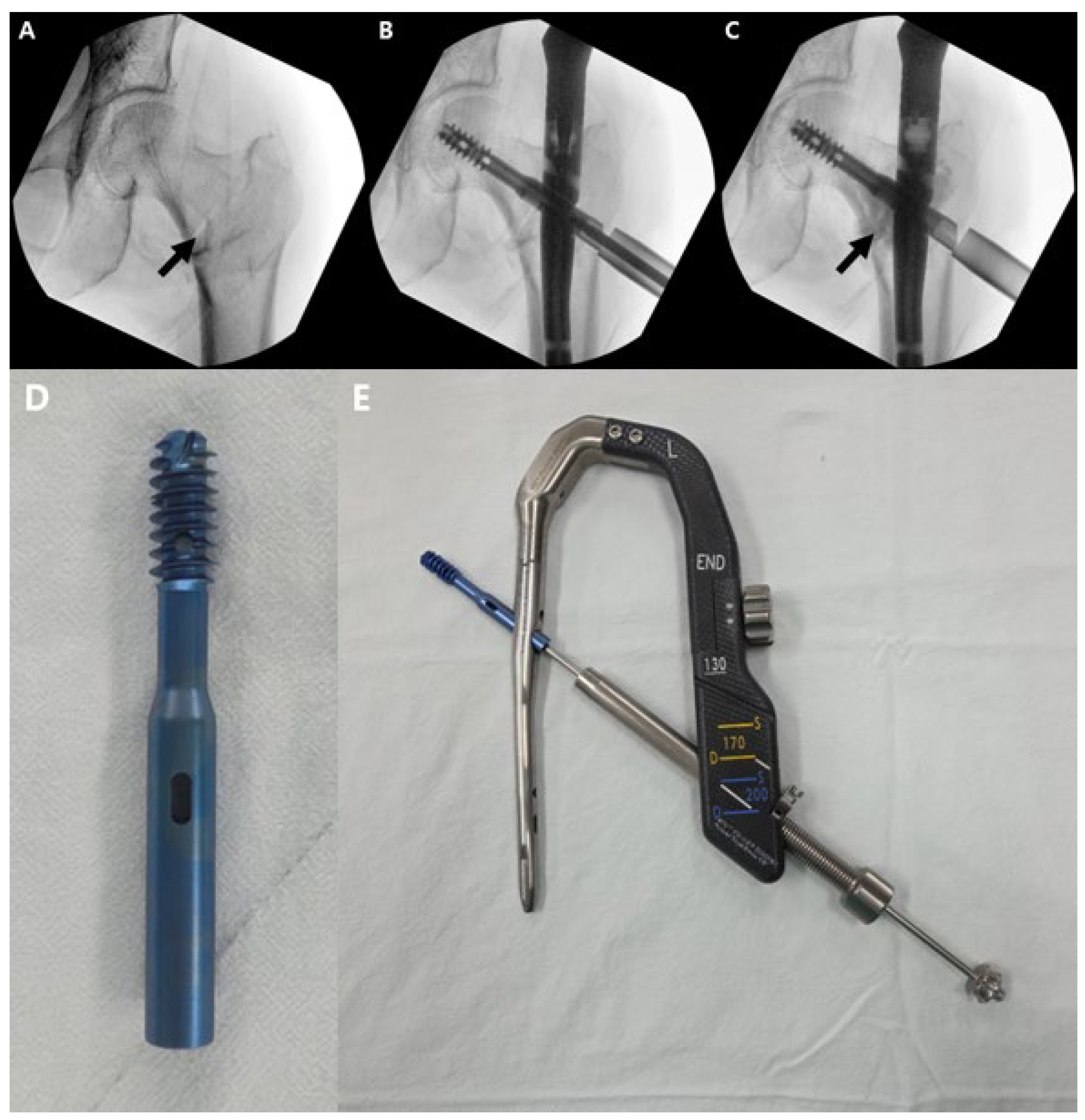- Gotfried, Y. Integrity of the Lateral Femoral Wall in Intertrochanteric Hip Fractures: An Important Predictor of a Reoperation. JBJS 2007, 89, 2552–2553. [Google Scholar] [CrossRef]