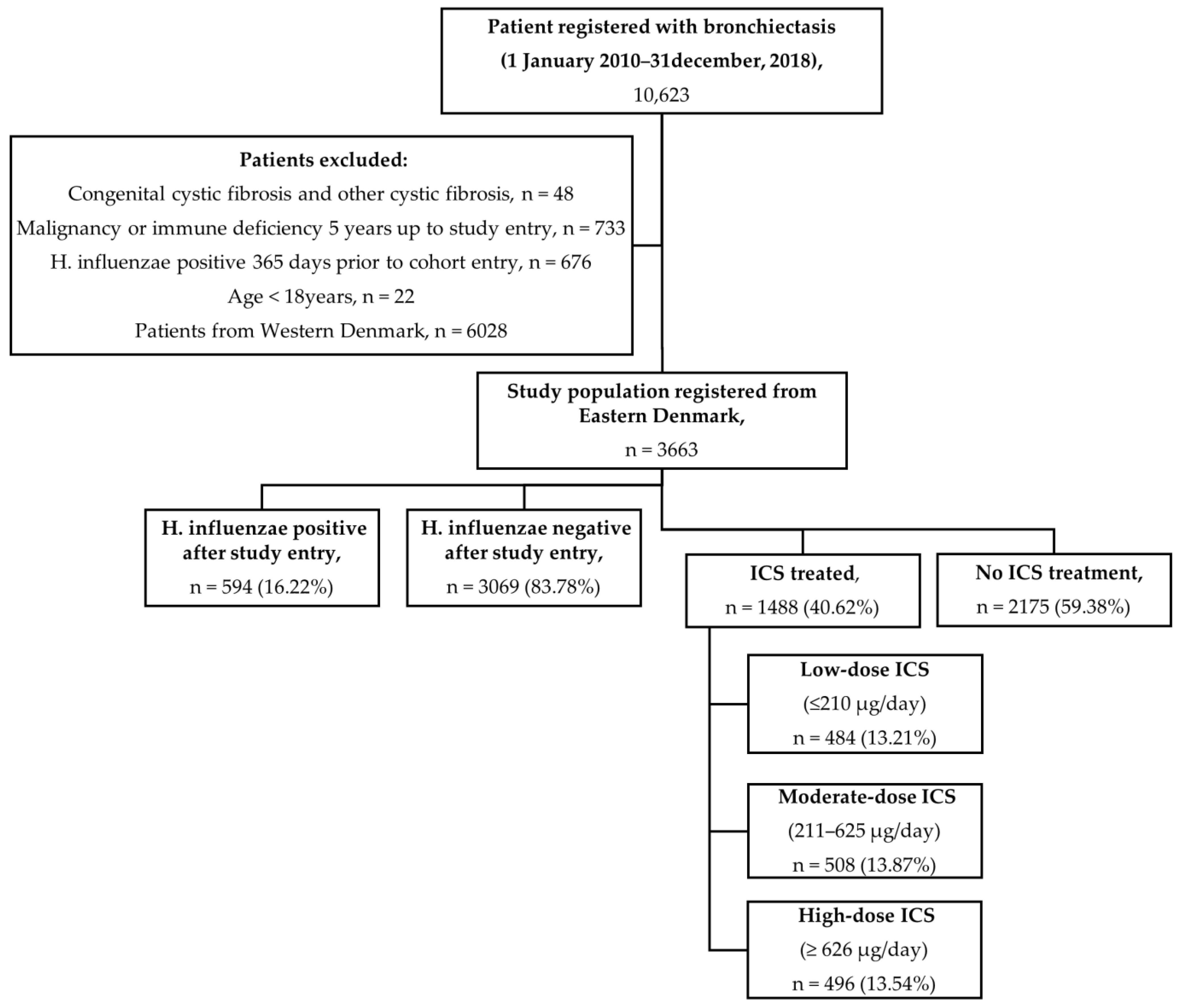Afrose D, Rønn CP, Eklöf J, Vognsen AK, Tønnesen LL, Bertelsen BB, Boel JB, Andersen CØ, Dessau RBC, Pinholt M, et al. Inhaled Corticosteroid Use and Risk of Haemophilus influenzae Isolation in Patients with Bronchiectasis: A Retrospective Cohort Study. Journal of Clinical Medicine. 2025; 14(23):8557. https://doi.org/10.3390/jcm14238557