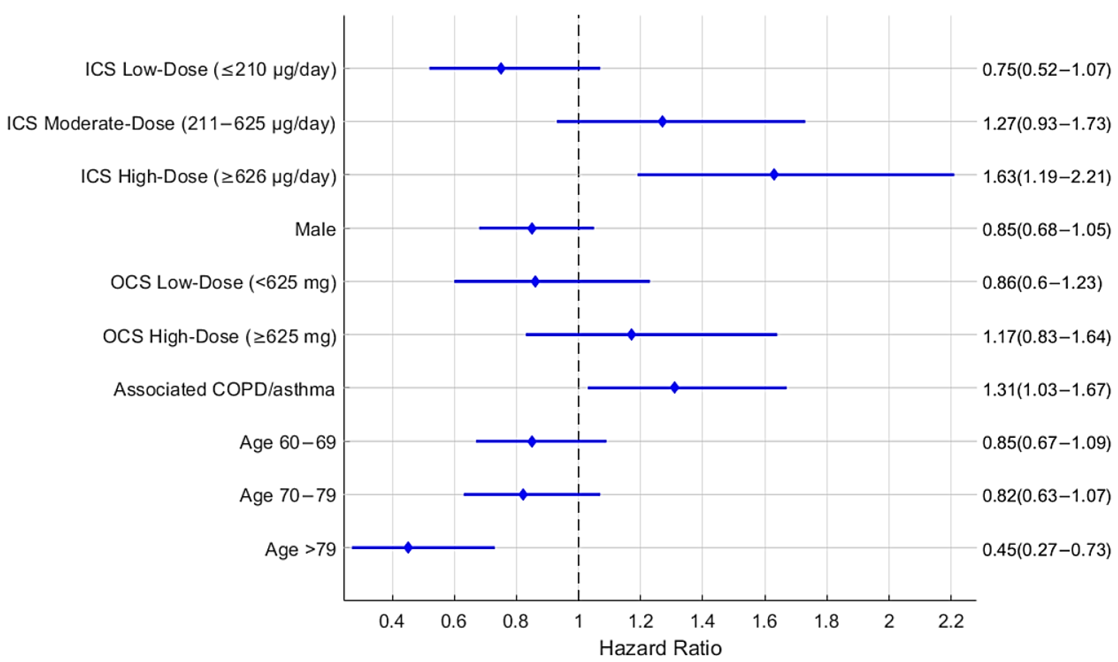 | High-dose ICSs (≥626 μg/day) | 1.61 | 1.02 | 2.54 | 0.042 |