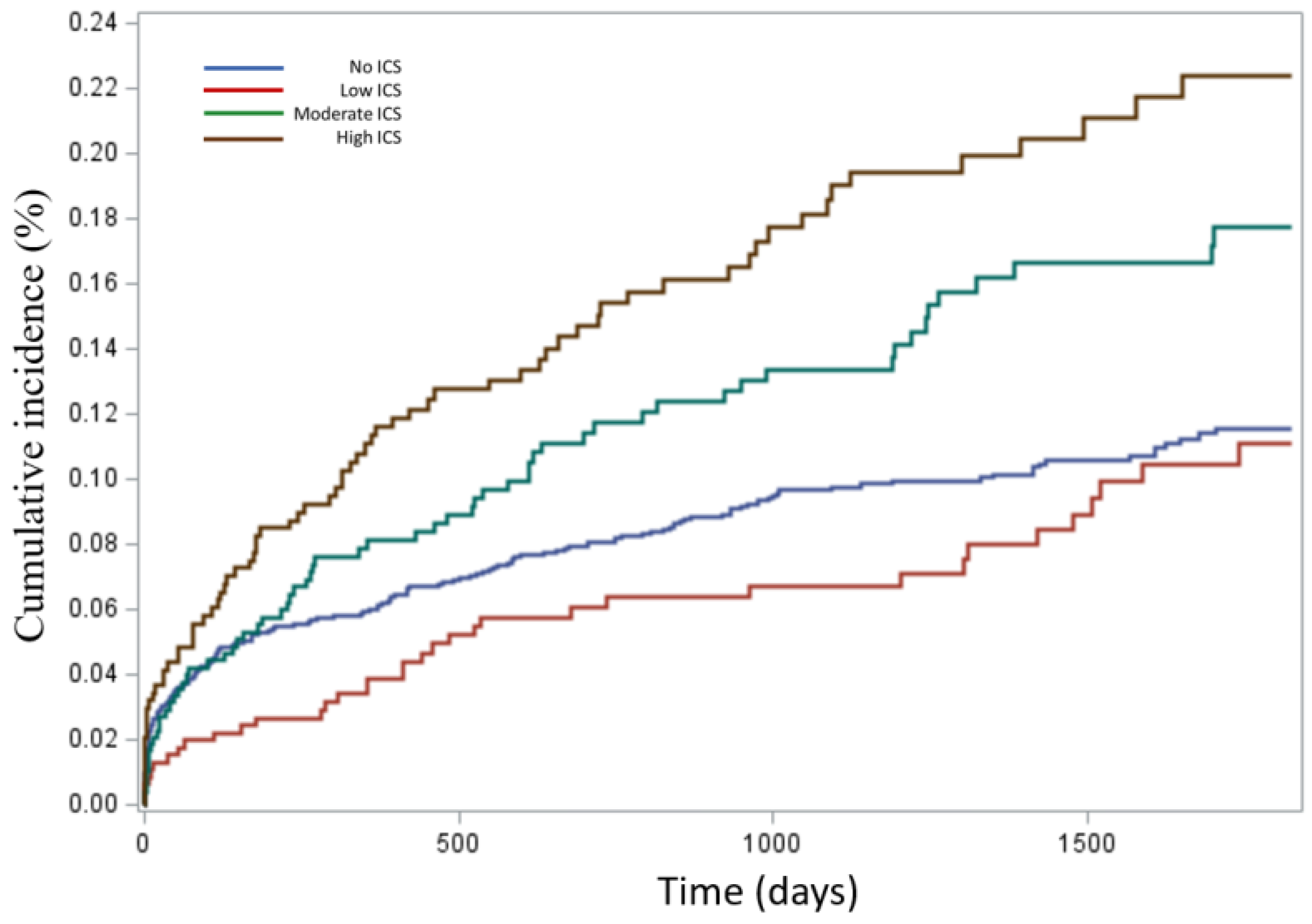 | Outcomes | No ICSs | Low-Dose ICSs (≤210 μg/day) | Moderate-Dose ICSs (211–625 μg/day) | High-Dose ICSs (≥626 μg/day) | Total |