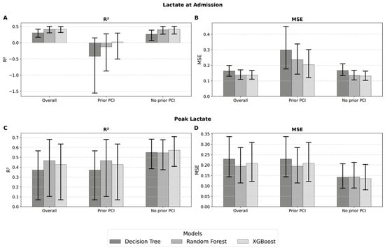 Model performance for lactate prediction. Comparison of Decision Tree, Random Forest, and XGBoost models for the prediction of log lactate values across all patients (overall) and in relation to the presence or absence of a prior percutaneous coronary intervention (PCI). The first row contains the prediction performance for the log admission lactate with (A) the R2 and (B) MSE. The second row shows the prediction performance of the log peak lactate with (C) the R2 and (D) MSE.