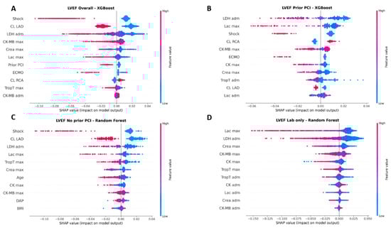 SHAP beeswarm of XGBoost regression for LVEF prediction. Depicted data were trained on (A) the full cohort as well as in relation to (B) the presence or (C) absence of a prior percutaneous coronary intervention (PCI) and (D) based on laboratory values only. CL, culprit lesion; LAD, left anterior descending; LDH, lactate dehydrogenase; adm, admission; max, maximum; CK, creatine kinase; MB, myocardial band, Crea, creatinine; Lac, lactate; ECMO, extracorporeal membrane oxygenation; RCA right coronary artery; TropT, troponin T; DAP, dose area product; BMI, body mass index.