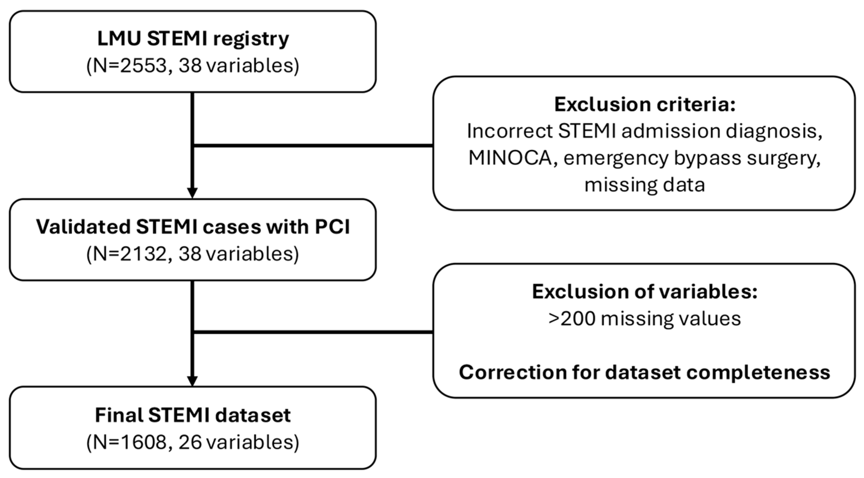 This retrospective cohort study was conducted at Ludwig-Maximilians-University (LMU) Hospital, Munich, Germany. We screened 2553 consecutive patients admitted with a primary diagnosis of STEMI between 2014 and 2023. Exclusion criteria included incorrect STEMI admission diagnosis, myocardial infarction with non-obstructive coronary arteries (MINOCA), indication for emergency bypass surgery, and incomplete datasets. After applying these criteria, 2132 patients remained eligible for our analysis. To ensure a fair comparison among different ensemble methods, we also drop predictors with more than 200 missing values (Figure 1, Supplementary Table S1).