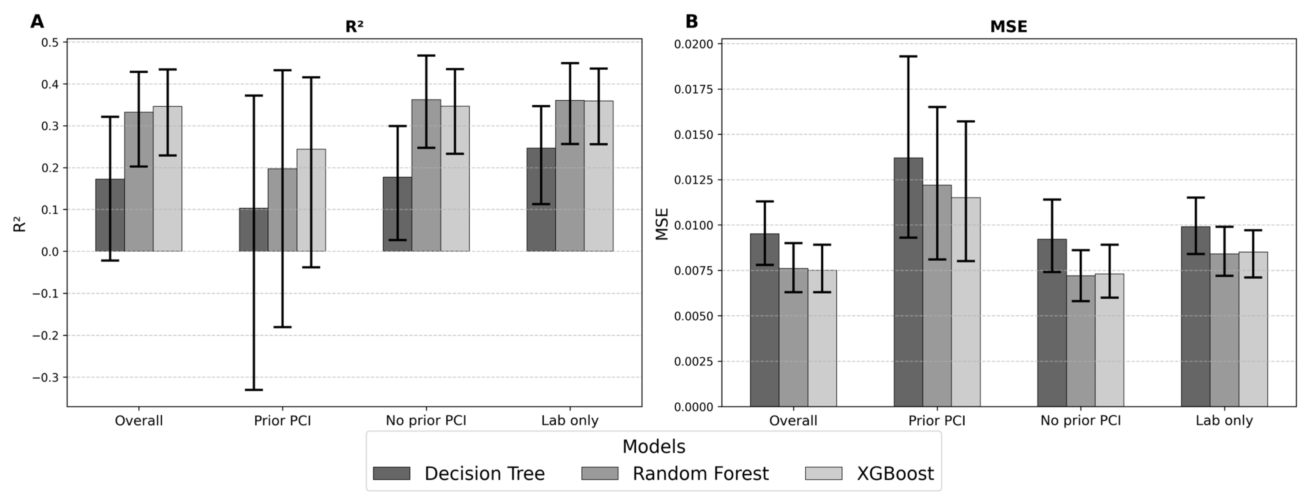 Table 4. Validation of LVEF prediction. Validation of the regression analysis for the prediction of LVEF for the full cohort, as well as in relation to the presence or absence of a prior PCI and based on laboratory values only as covariates. The results are compared based on mean squared error (MSE), root mean squared error (RMSE), mean absolute error (MAE), coefficient of determination (R2), explained variance score (EVS), and mean absolute percentage error (MAPE).