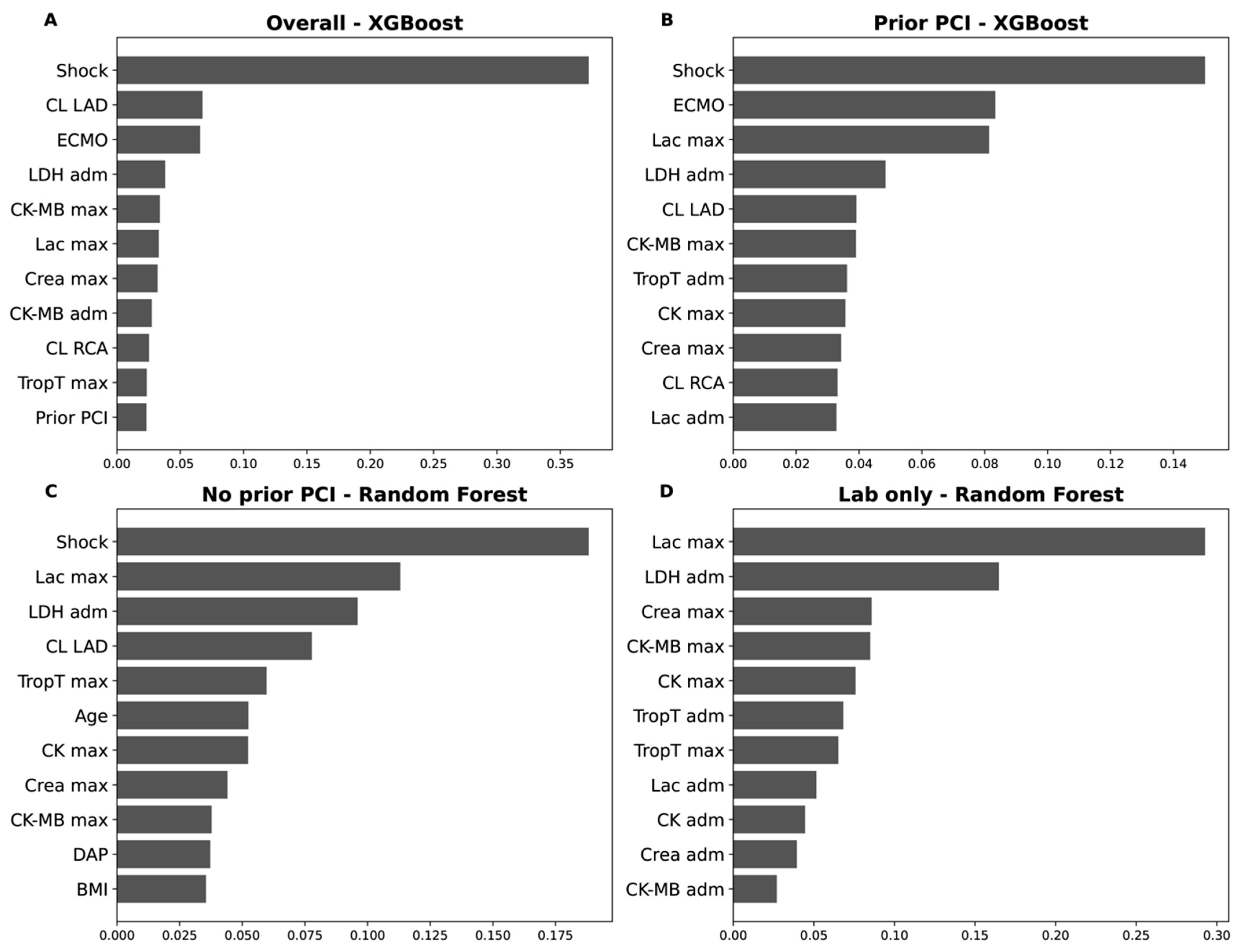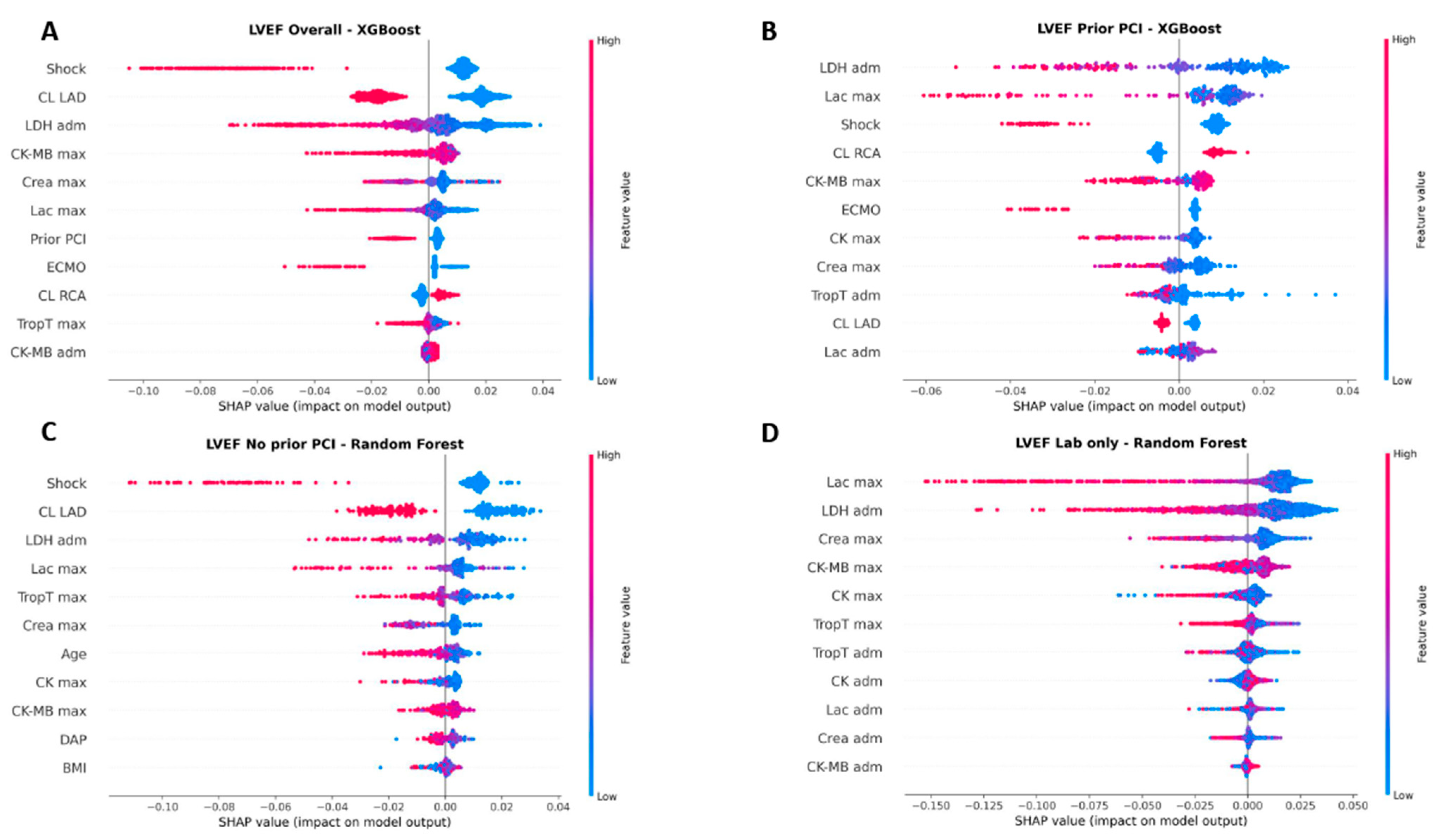 Despite the recognized importance of early LV function, there is still a lack of robust and clinically applicable prediction tools based solely on readily available parameters in the acute care setting. In recent years, artificial intelligence (AI) and ML approaches have shown great potential in the field of cardiovascular risk prediction. These methods can incorporate large numbers of variables and uncover complex, non-linear associations that may be missed by traditional statistical models. Initial studies applying ML to post-MI prognosis have reported promising predictive accuracy, suggesting that AI may augment clinical decision-making in this context. However, one of the largest studies on this topic included 1220 patients with myocardial infarction and focused on long-term prognosis. It achieved remarkable predictive power with the Extreme Gradient Boosting (XGBoost) model (AUC = 0.92) in relation to the development of heart failure. The leading predictive parameters based on SHAP analyses were LV function, LV end-systolic diameter, and LDH [22].