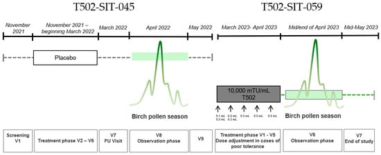 The study included nine visits: one screening visit, five pre-seasonal treatment visits, one follow-up, and two visits during and after the peak pollen season (Figure 1). Subcutaneous injections were administered at intervals of 7 to 30 days between visits V2 and V6 prior to the pollen season. Each dose consisted of 0.5 mL, divided into two injections during the first visit: 0.2 mL in one arm and 0.3 mL in the other after a 30 min interval. In total, 246 patients were randomized into one placebo group and three active treatment groups with different T502 concentrations.