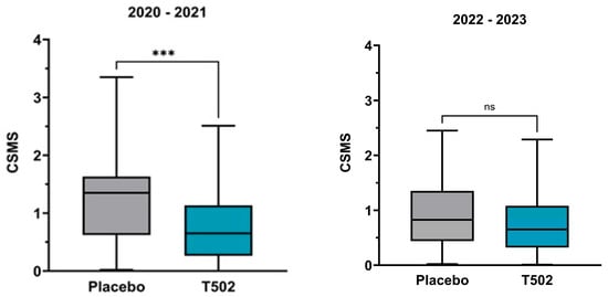 Changes in the median and interquartile CSMS. (Left)—patients who received placebo in the T502-SIT-020 study in 2020 and active treatment in the T502-SIT-041 study in 2021; (right)—patients who received placebo in the T502-SIT-045 study in 2022 and a shorter regimen treatment in the T502-SIT-059 study in 2023. *** p ≤ 0.001, ns indicates non-significant.