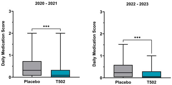 Changes in the median and interquartile dMS. (Left)—patients who received placebo in the T502-SIT-020 study in 2020 and active treatment in the T502-SIT-041 study in 2021; (right)—patients who received placebo in the T502-SIT-045 study in 2022 and a shorter regimen treatment in the T502-SIT-059 study in 2023. *** p ≤ 0.001.