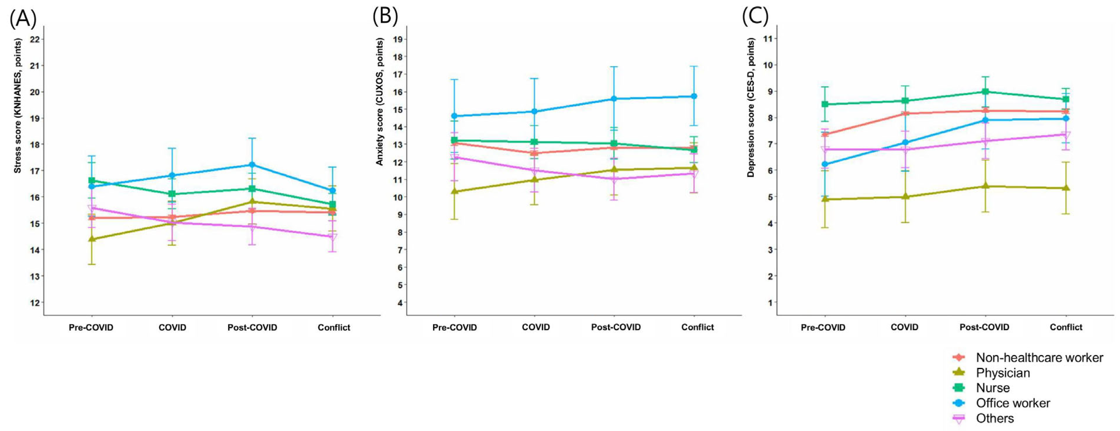 Temporal changes by occupation were analyzed using linear mixed-effects models (Table 2, Figure 1). Among non-healthcare workers, stress scores increased significantly compared with the pre-COVID period, by 0.26 points during the post-COVID period and 0.20 points during the medical–government conflict period (both p < 0.001). In attending physicians, stress scores increased more markedly than in other occupational groups, by 1.44 points in the post-COVID period (p < 0.001) and 1.17 points during the conflict period (p = 0.006). In contrast, stress scores decreased significantly during the conflict period among nurses (−0.91, p = 0.002) and other staff (−1.09, p = 0.001). Anxiety scores consistently decreased across all periods among non-healthcare workers (all p < 0.001), whereas they increased among attending physicians by 1.25 points in the post-COVID period (p = 0.012) and 1.36 points during the conflict period (p = 0.013). Depression scores increased significantly across all periods among non-healthcare workers (all p < 0.001), with office workers showing the most pronounced increases, by 1.66 points in the post-COVID period (p = 0.003) and 1.74 points during the conflict period (p = 0.001). No significant changes in depression scores were observed among nurses or other staff.