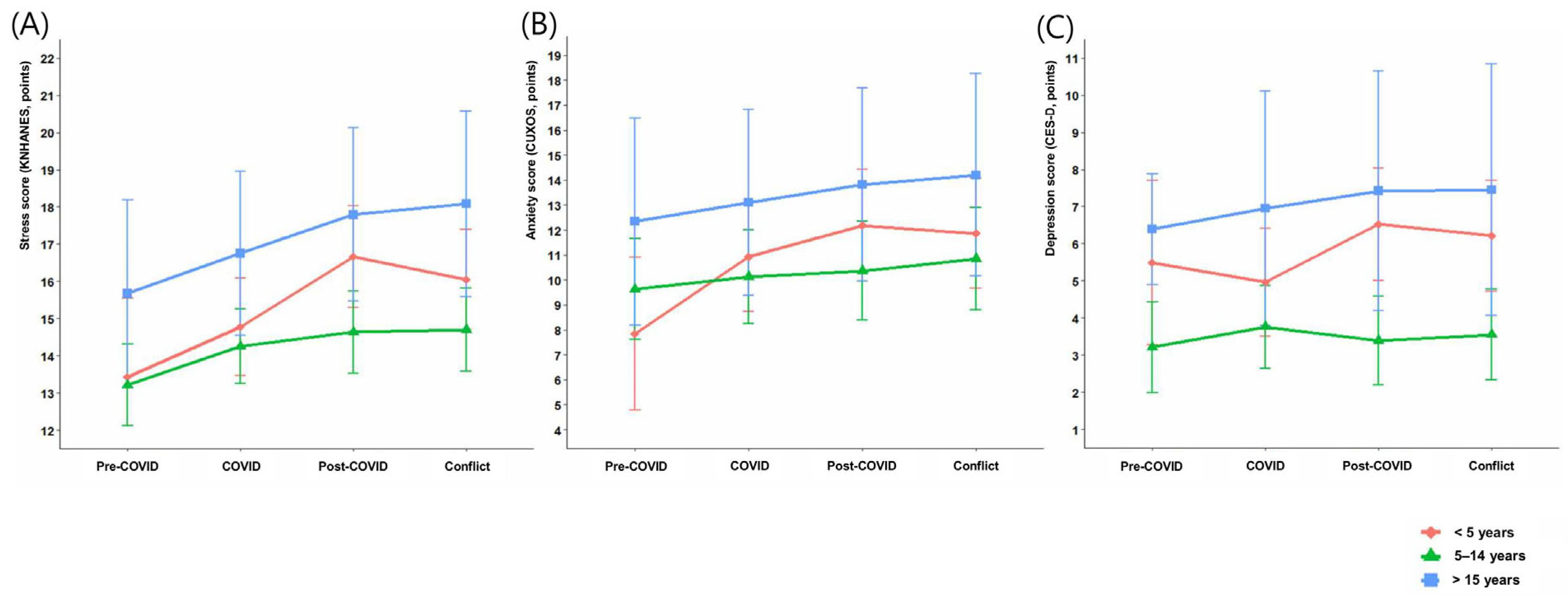 Subgroup analyses were performed among attending physicians, who were expected to experience the greatest burden due to the collective withdrawal of residents, according to sex, age, and length of service. In sex-stratified analyses, stress scores in male physicians increased by 1.14 points in the post-COVID period (p = 0.015), whereas female physicians showed larger increases of 2.08 points in the post-COVID period (p = 0.008) and 1.73 points during the conflict period (p = 0.030). By age group, physicians in their 30s exhibited the greatest increases in stress, with 3.13 points in the post-COVID period (p = 0.007) and 3.18 points during the conflict period (p = 0.008). Physicians in their 40s also showed significant increases of 1.90 (p = 0.001) and 1.64 points (p = 0.006), respectively. Anxiety scores increased among male physicians in the post-COVID (1.42, p = 0.014) and conflict periods (1.45, p = 0.024), and in physicians in their 30s and 40s across both periods. Depression scores increased significantly only among physicians in their 40s, by 1.25 points during the post-COVID period (p = 0.018). By length of service, physicians with <5 years showed significant increases in stress scores during the post-COVID (3.25, p = 0.002) and conflict periods (2.62, p = 0.018), along with consistent increases in anxiety scores across all periods. Physicians with 5–14 years of service showed significant increases only in stress scores, whereas those with ≥15 years showed no significant changes in stress, anxiety, or depression (Table 3, Figure 2).