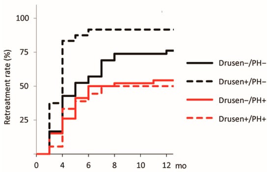 The treatment outcomes at 12 months after the initial treatment are summarized in Table 2. The logMAR and CRT values did not differ among the groups at baseline and 12 months after the initial treatment. In contrast, the SFCT values differed significantly (F = 7.30 and 6.40, respectively, p < 0.001 for both). The choroidal thicknesses of the Drusen−/PH+ group at baseline and 12 months after the initial treatment (282.2 and 248.2 µm, respectively) were significantly greater than those of the Drusen+/PH− group (p < 0.001 for both). The other pairwise differences were not significant. The number of injections differed significantly across the groups (F = 4.71, p = 0.004). The Drusen+/PH− group required more injections than the Drusen−/PH+ (p = 0.002) and Drusen+/PH+ (p = 0.046) groups. The other pairwise differences were not significant. The 12-month retreatment rates for the Drusen−/PH−, Drusen+/PH−, Drusen−/PH+, and Drusen+/PH+ groups were 76.2% (32/42), 91.7% (22/24), 54.3% (25/46), and 50.0% (9/18), respectively. The differences were statistically significant (log-rank p < 0.001; Figure 3). The Drusen+/PH− group had higher 12-month retreatment rates than the Drusen−/PH− group (hazard ratio [HR] = 2.05; p = 0.016; 95% confidence interval [CI]: 1.14–3.67), Drusen−/PH+ (HR = 3.22; p < 0.001; 95% CI: 1.70–6.13), and Drusen+/PH+ (HR = 3.54; p = 0.002; 95% CI: 1.60–7.84) groups.