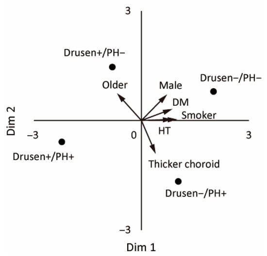 We used metric MDS to visualize the etiology-based classification without any assumptions. The group centroids (means of log/z-standardized age, sex, smoking history, hypertension, diabetes, and SFCT) were mapped in 2D, and the four groups were well separated (Figure 4). The biplot indicated positive alignments of Dimension 1 with ever-smoker status, hypertension, diabetes, and male sex (loadings ≈ 0.99, 0.87, 0.86, and 0.70) and a negative alignment with older age (loading ≈ −0.68). Dimension 2 was positively aligned with older age and male sex (loadings ≈ 0.74 and 0.71) and negatively aligned with greater SFCT (loading ≈ −0.90). The Drusen−/PH− group tended to have positive scores for Dimensions 1 and 2. The Drusen+/PH− group had positive displacement along Dimension 2 (older age). The Drusen−/PH+ group had lower scores for Dimension 2 (thicker choroid). The Drusen+/PH+ group was positioned approximately midway between the Drusen−/PH+ and Drusen+/PH− groups when the data were restricted to three categories (excluding the Drusen−/PH− group). This finding is consistent with a mixed phenotype.