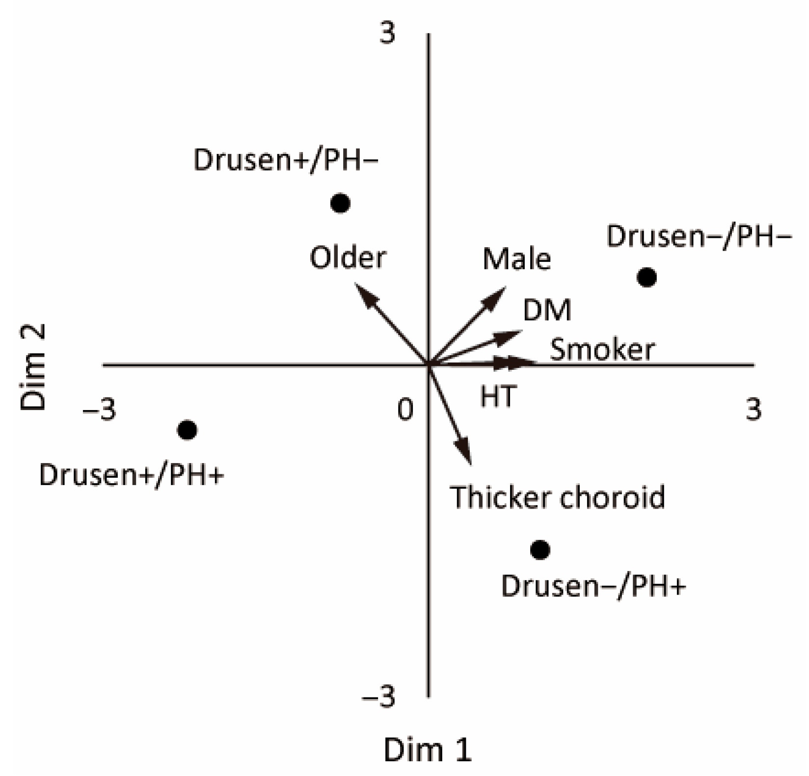 | Characteristic | Drusen−/PH− (n = 42) | Drusen+/PH− (n = 24) | Drusen−/PH+ (n = 46) | Drusen+/PH+ (n = 18) | F, p |