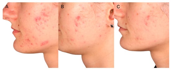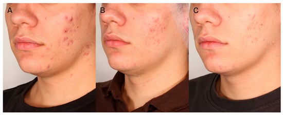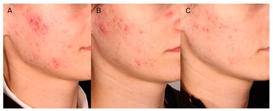 To prepare photographic documentation, the Fotomedicus clinical photography kit from Elfo (Dębica, Poland), which allows for image acquisition in unpolarized and cross-polarized light, was used. The number of inflammatory lesions on the left and right sides of the face was counted using clinical photographs. The severity of acne was assessed using the widely accepted Investigator’s Global Assessment (IGA) scale. The IGA is a five-point scale ranging from 0 to 4, where 0 indicates clear skin with no lesions; 1 corresponds to almost clear skin with minimal lesions and slight symptoms; 2 denotes mild severity with noticeable but mild lesions; 3 reflects moderate severity with marked lesions present across several facial areas; and 4 signifies severe acne with numerous extensive lesions, significant inflammation, scarring, and cysts. This assessment considers not only the quantity of lesions, but also their types—including comedones, papules, pustules, nodules, and scars—as well as their distribution and extent.