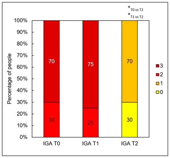 Figure 5). Post hoc analysis indicated that statistically significant differences were observed between the IGA values recorded before treatment (T0) and two months after completing both treatments (T2) (