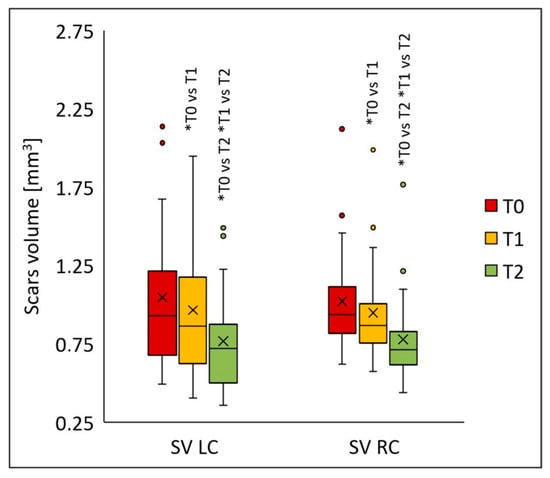 p < 0.001). On the left cheek, the median scar volume was 0.926 (T0), 0.863 (T1), and 0.718 (T2); on the right cheek, 0.938 (T0), 0.868 (T1), and 0.713 (T2). Compared to baseline, the median scar volume declined by 6.9% (T1) and 22.5% (T2) on the left cheek, and by 7.5% (T1) and 23.9% (T2) on the right cheek.