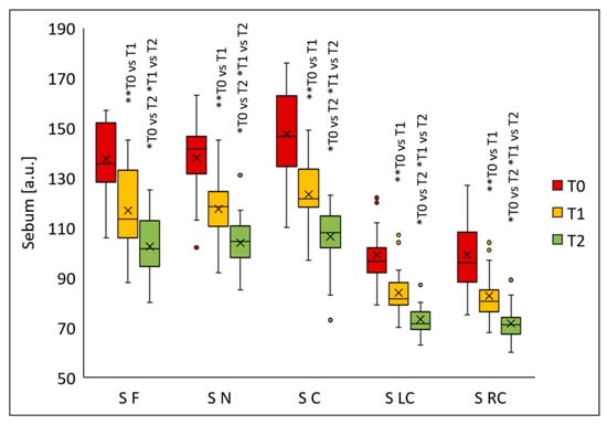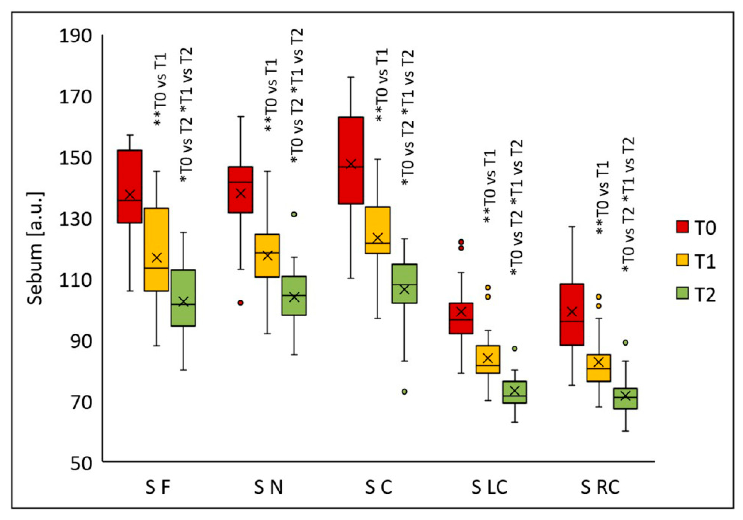 p < 0.001). The median sebum values were as follows: forehead—135.5 (T0), 113.5 (T1), 101.5 (T2); nose—141.5 (T0), 118.5 (T1), 104.5 (T2); chin—146.5 (T0), 121.5 (T1), 108.0 (T2); left cheek—96.5 (T0), 81.5 (T1), 71.5 (T2); right cheek—96.0 (T0), 80.5 (T1), 71.0 (T2). Relative to baseline, median sebum secretion decreased 16.2% (T1) and 25.1% (T2) on the forehead, 16.3% (T1) and 26.1% (T2) on the nose, 17.1% (T1) and 26.3% (T2) on the chin, 15.5% (T1) and 25.9% (T2) on the left cheek, and 16.1% (T1) and 26.0% (T2) on the right cheek.