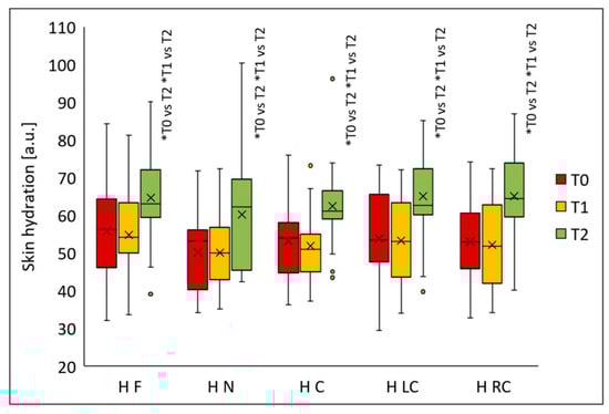 p < 0.001). Median hydration values were: forehead—56.2 (T0), 54.2 (T1), 63.0 (T2); nose—53.3 (T0), 50.0 (T1), 62.2 (T2); chin—54.0 (T0), 50.9 (T1), 61.1 (T2); left cheek—53.5 (T0), 53.0 (T1), 62.7 (T2); and right cheek—53.0 (T0), 51.8 (T1), 64.4 (T2). Compared to baseline, median skin hydration increased after two months from the last treatment by 12.1% on the forehead, 16.7% on the nose, 13.1% on the chin, 17.2% on the left cheek, and 21.6% on the right cheek.