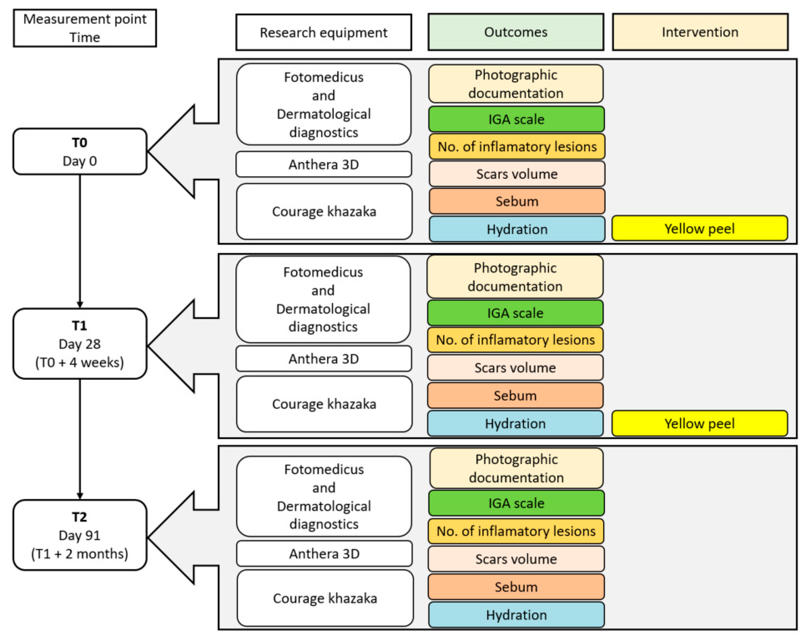 The study included 20 subjects (17 women and 3 men; phototype II) aged 20 to 25 who suffered from light or moderate acne lesions located on the face. The classification of acne severity was based on the Investigator’s Global Assessment (IGA) scale. Qualifications for treatments were performed by a dermatologist based on a protocol and taking into account the adopted inclusion and exclusion criteria. The inclusion criteria were as follows: patients over 18 years of age who could decide on their own about participation in the study, patients with inflammatory lesions and atrophic scars in the course of acne vulgaris eligible for chemical peeling therapy, no general or local antibiotic therapy in the area assessed, no treatment with general and local steroid drugs in the area assessed, male and female patients, patients able to understand the purpose and risks associated with the study after signing the patient informed consent form to participate in the study. The exclusion criteria included pregnancy or breastfeeding, bacterial skin diseases other than acne vulgaris, viral, parasitic, fungal infections (especially tuberculosis), HIV infection, HBV infection, people diagnosed with systemic lupus erythematosus, demyelinating diseases, active cancer and severe circulatory failure, lack of informed consent and cooperation of the patient, and abuse of drugs or alcohol by the patient revealed in the interview.