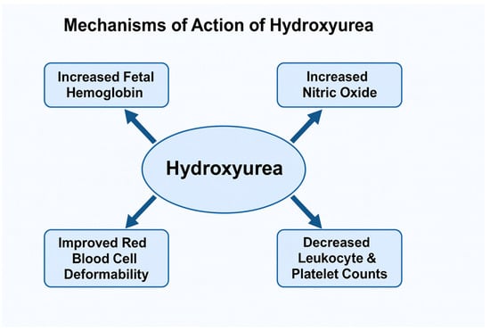 In the context of SCA, HU’s therapeutic benefit extends beyond its cytotoxic properties, encompassing a range of pleiotropic hematologic, vascular, and molecular effects. The most prominent and well-characterized mechanism is the induction of HbF synthesis. HU stimulates HbF production by reactivating γ-globin gene expression in erythroid precursor cells. Its cytotoxic action induces mild bone marrow stress, which leads to compensatory erythropoietin release and expansion of erythroid progenitors with higher HbF production potential [28,29]. Increased HbF levels dilute intracellular concentrations of HbS and inhibit its polymerization under deoxygenated conditions, thereby preventing RBC sickling [21,30,31,32].