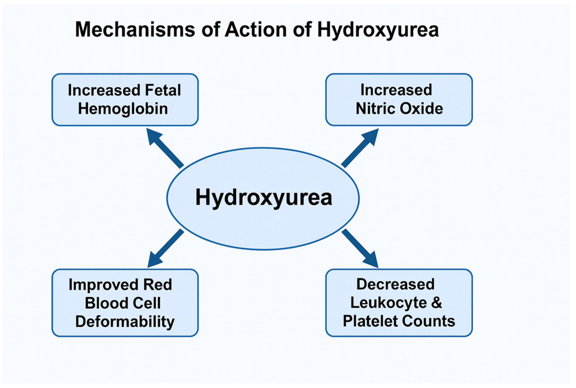 The mechanism of action of HU extends well beyond its hematological effects, encompassing a broad spectrum of influences on multiple physiological systems. Its pleiotropic properties have been demonstrated to modulate not only erythropoiesis and vascular dynamics but also neurological, immunological, and endocrinological functions. These systemic effects contribute substantially to the overall clinical benefits observed in patients with SCA, underscoring HU’s role as a comprehensive disease-modifying therapy rather than a purely hematologic agent.