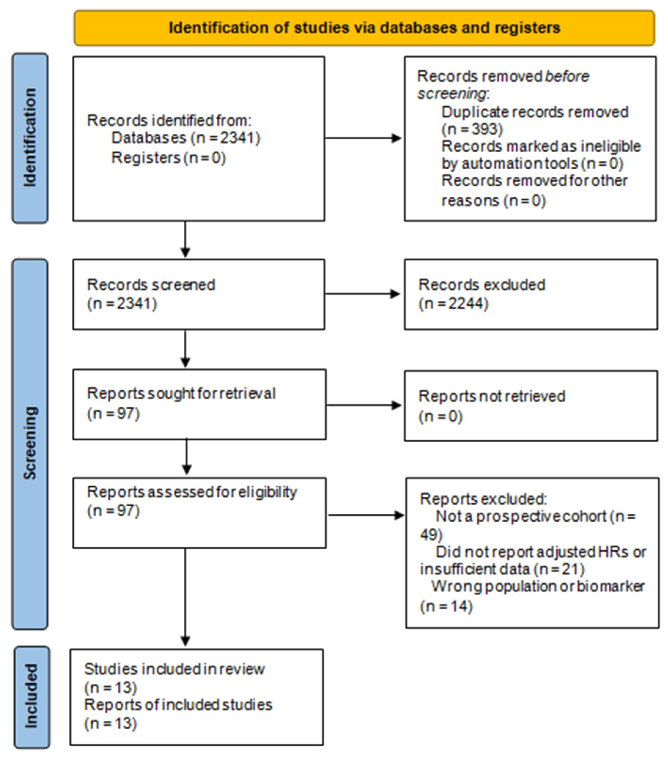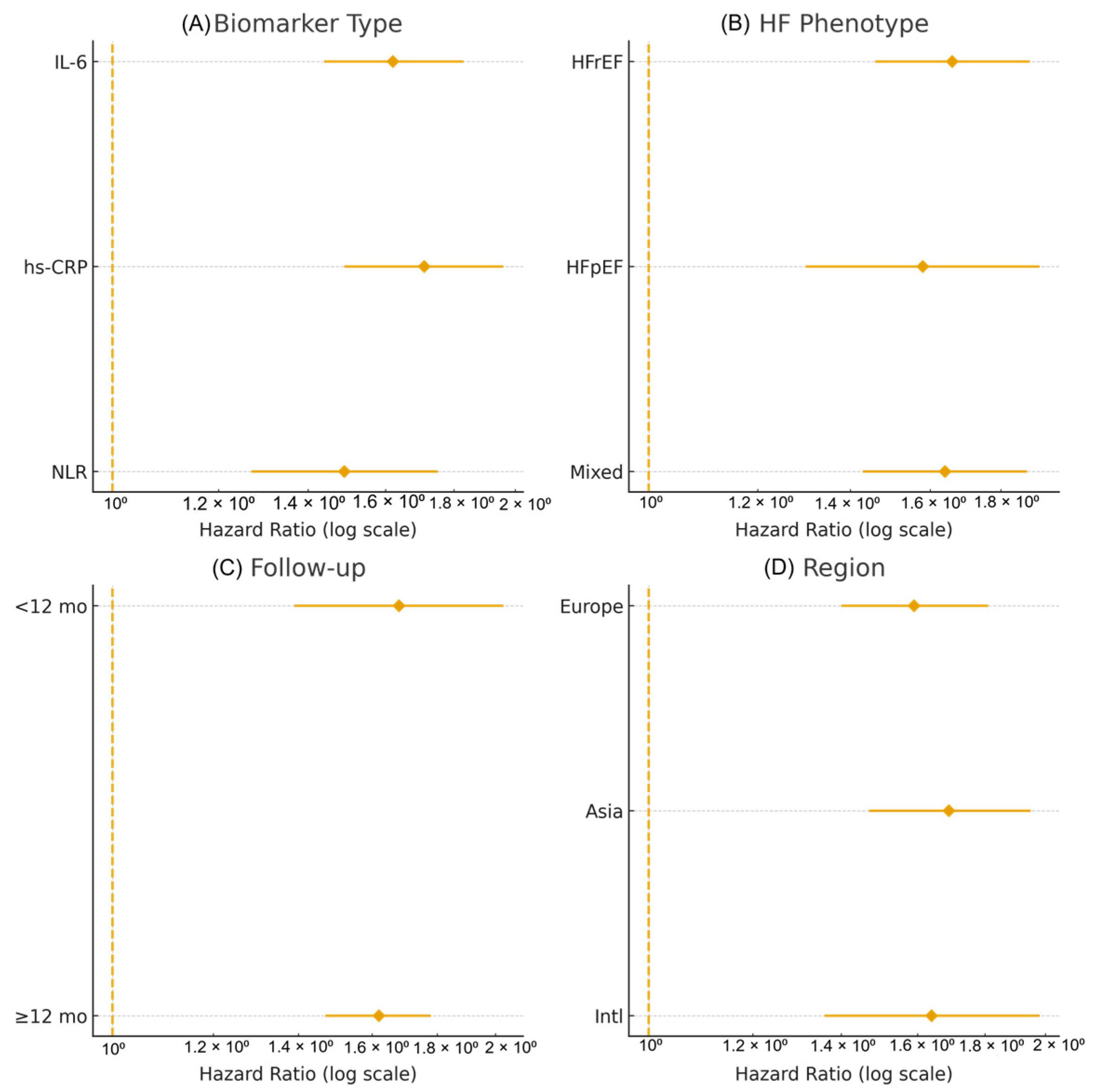 Chicago/Turabian StylePah, Ana-Maria, Stefania Serban, Diana-Maria Mateescu, Ioana-Georgiana Cotet, Camelia-Oana Muresan, Adrian-Cosmin Ilie, Florina Buleu, Maria-Laura Craciun, Simina Crisan, and Adina Avram. 2025. "Systemic Inflammatory Biomarkers (Interleukin-6, High-Sensitivity C-Reactive Protein, and Neutrophil-to-Lymphocyte Ratio) and Prognosis in Heart Failure: A Meta-Analysis of Prospective Cohort Studies" Journal of Clinical Medicine 14, no. 23: 8610. https://doi.org/10.3390/jcm14238610