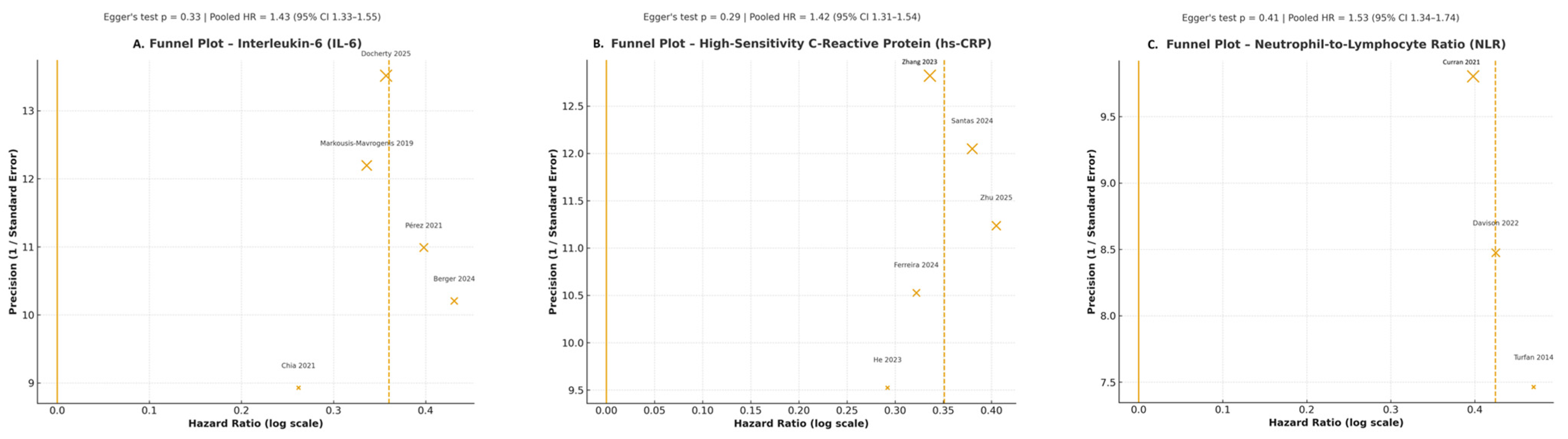 APA StylePah, A.-M., Serban, S., Mateescu, D.-M., Cotet, I.-G., Muresan, C.-O., Ilie, A.-C., Buleu, F., Craciun, M.-L., Crisan, S., & Avram, A. (2025). Systemic Inflammatory Biomarkers (Interleukin-6, High-Sensitivity C-Reactive Protein, and Neutrophil-to-Lymphocyte Ratio) and Prognosis in Heart Failure: A Meta-Analysis of Prospective Cohort Studies. Journal of Clinical Medicine, 14(23), 8610. https://doi.org/10.3390/jcm14238610