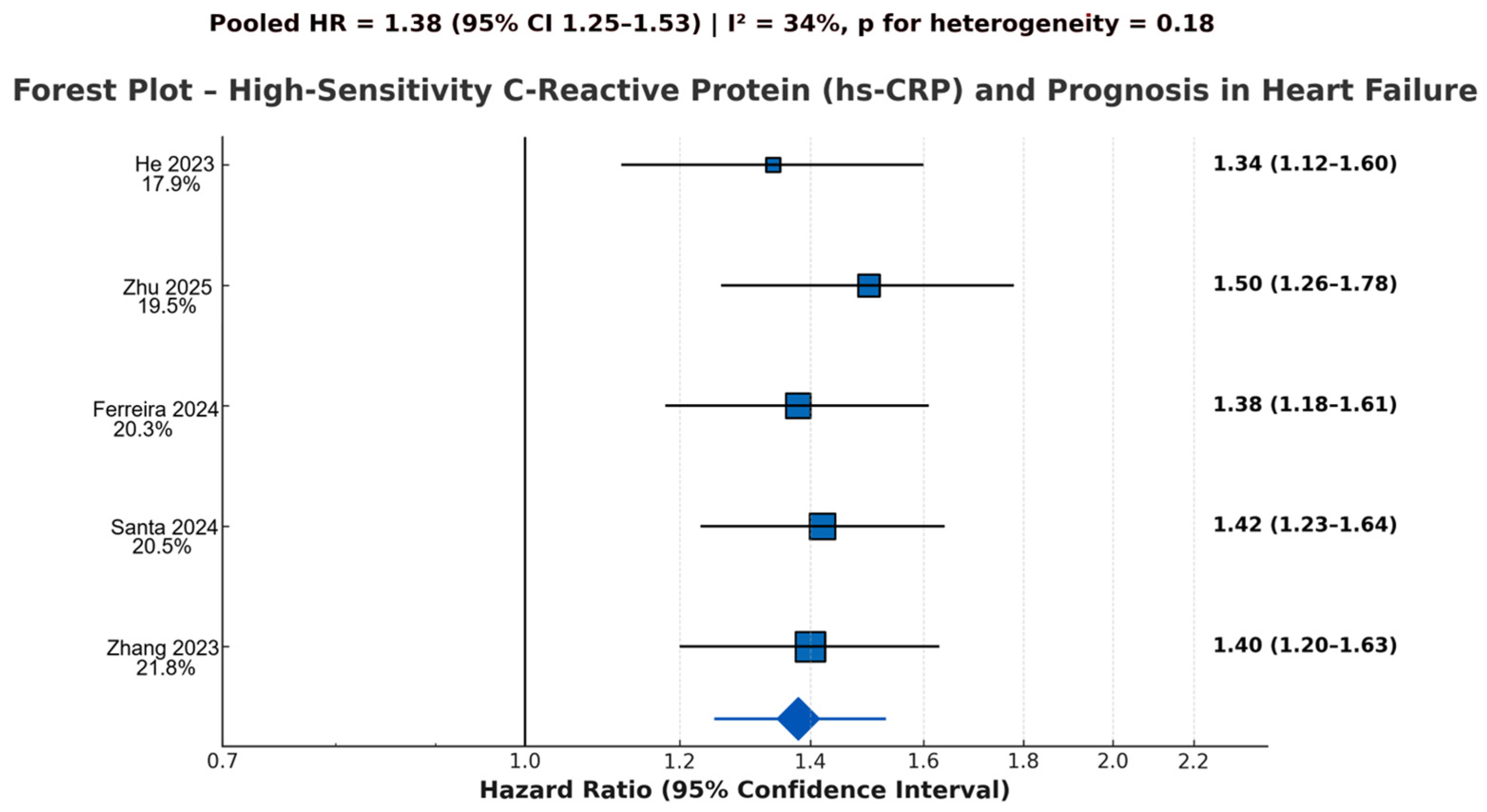| Zhang 2023 [19] | JAHA cumulative hs-CRP | China | Prospective multicentre, 1 year | 2156 | 67 | 36 | Acute HF | Admission + serial | All-cause mortality | 1.40 (1.24–1.58) | 8 |