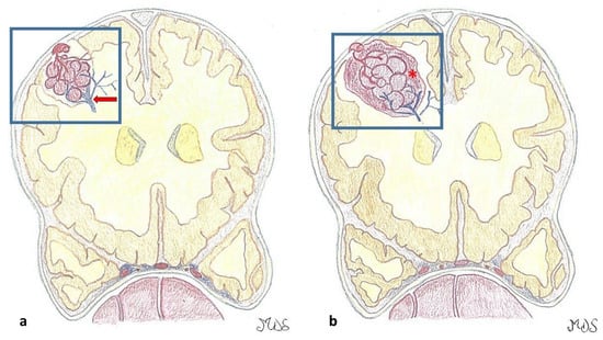 - Abla, A.; Wait, S.D.; Uschold, T.; Lekovic, G.P.; Spetzler, R.F. Developmental Venous Anomaly, Cavernous Malformation, and Capillary Telangiectasia: Spectrum of a Single Disease. Acta Neurochir. 2008, 150, 487–489; discussion 489. [Google Scholar] [CrossRef]