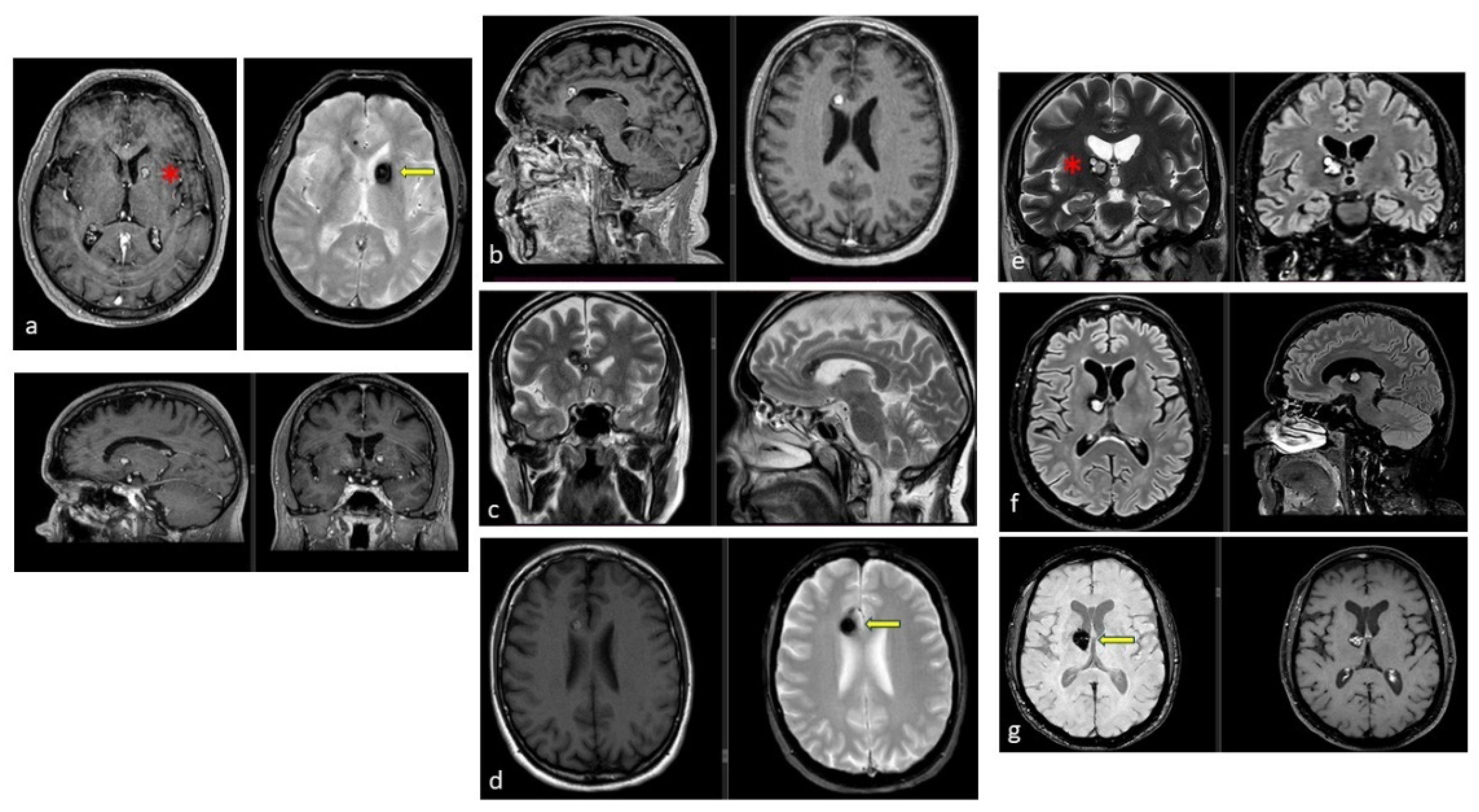 - Akers, A.L.; Albanese, J.; Alcazar-Felix, R.J.; Al-Shahi Salman, R.; Awad, I.A.; Connolly, E.S.; Danehy, A.; Flemming, K.D.; Gordon, E.; Hage, S.; et al. Guidelines for the Diagnosis and Clinical Management of Cavernous Malformations of the Brain and Spinal Cord: Consensus Recommendations Based on a Systematic Literature Review by the Alliance to Cure Cavernous Malformation Clinical Advisory Board Experts Panel. Neurosurgery 2025. [Google Scholar] [CrossRef]