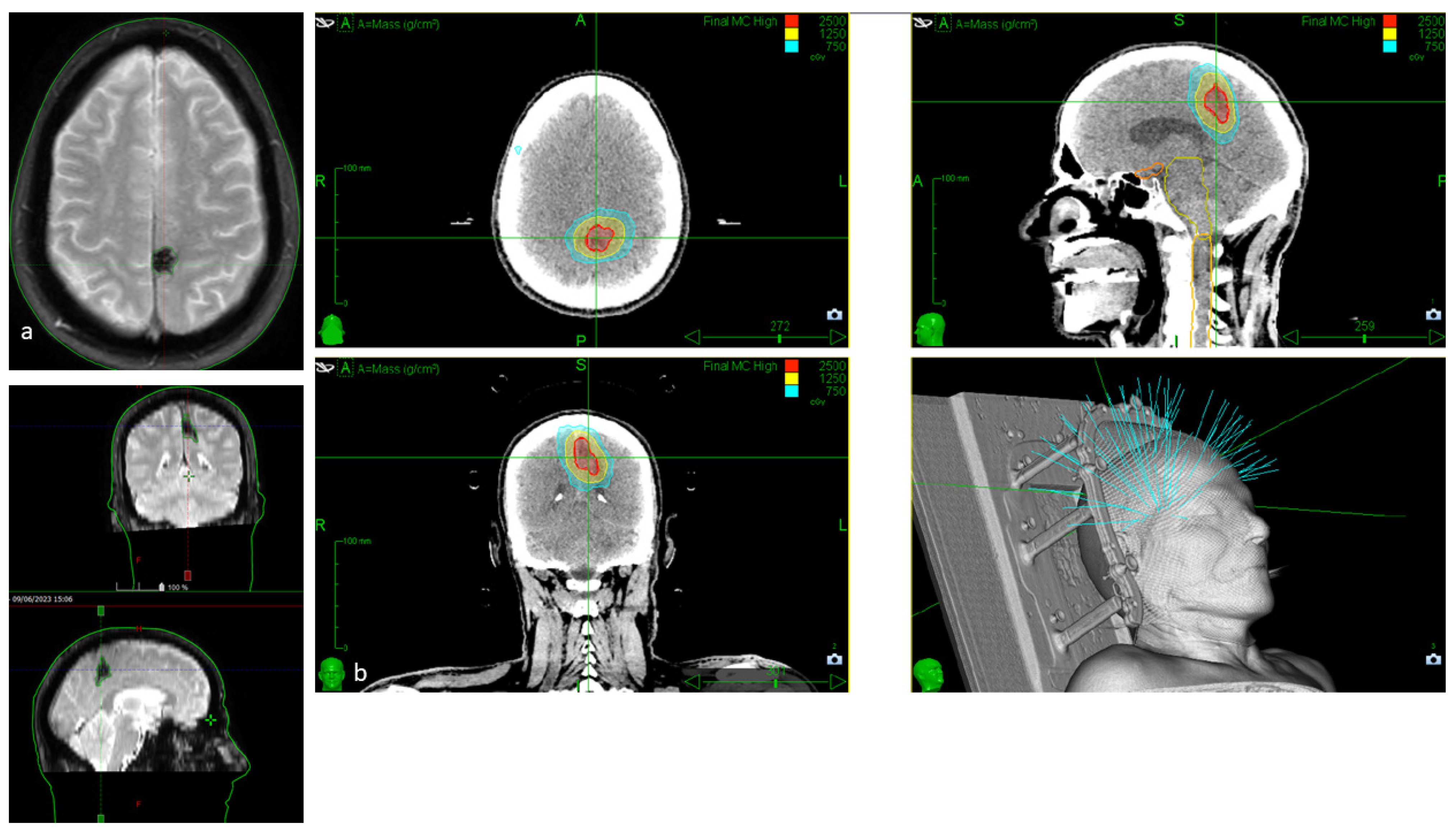 - Harat, M.; Lebioda, A.; Lasota, J.; Makarewicz, R. Evaluation of Brain Edema Formation Defined By MRI After LINAC-Based Stereotactic Radiosurgery. Radiol. Oncol. 2017, 51, 137–141. [Google Scholar] [CrossRef] [PubMed]