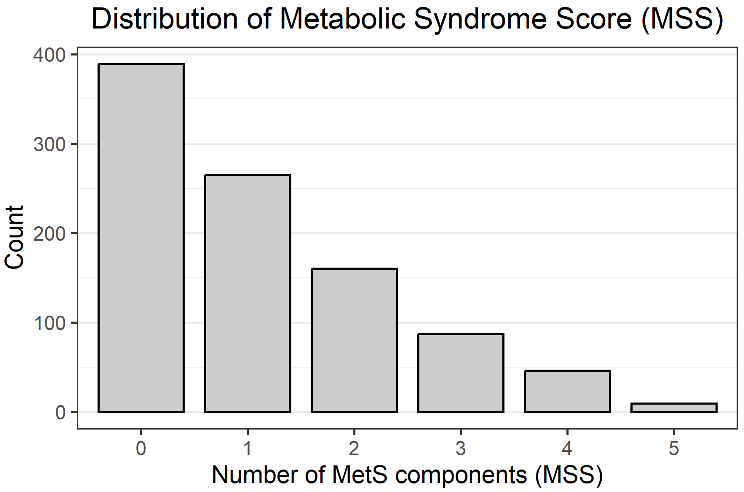 A total of 956 participants with complete data on anthropometric, biochemical, and blood pressure parameters were included in the analyses. Overall, 142 individuals (14.9%) met the criteria for metabolic syndrome (MetS_bin = 1; MSS ≥ 3), while 814 (85.1%) did not have MetS (MetS_bin = 0). The distribution of the Metabolic Syndrome Score (MSS) was skewed towards lower values: 0, 1, 2, 3, 4, and 5 components were present in 389 (40.7%), 265 (27.7%), 160 (16.7%), 87 (9.1%), 46 (4.8%), and 9 (0.9%) participants, respectively, reflecting the predominance of individuals with ≤2 MetS components in this donor cohort. The distribution of MSS values across the cohort is shown in Figure 1.