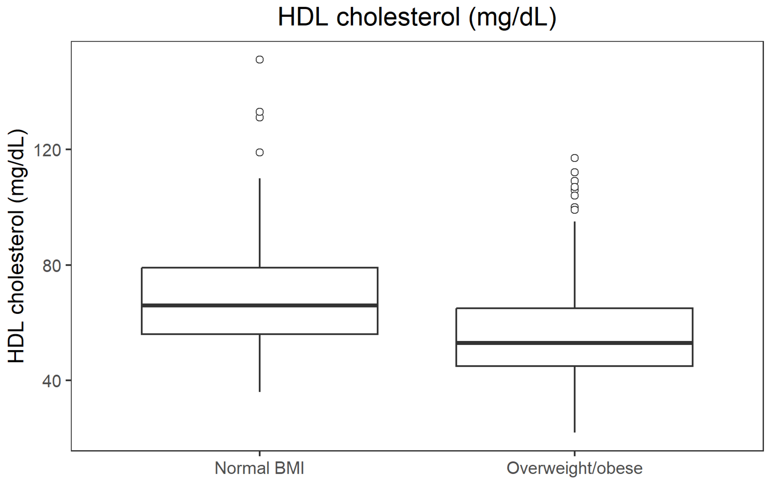 Figure 3. Boxplot of HDL cholesterol by BMI category.