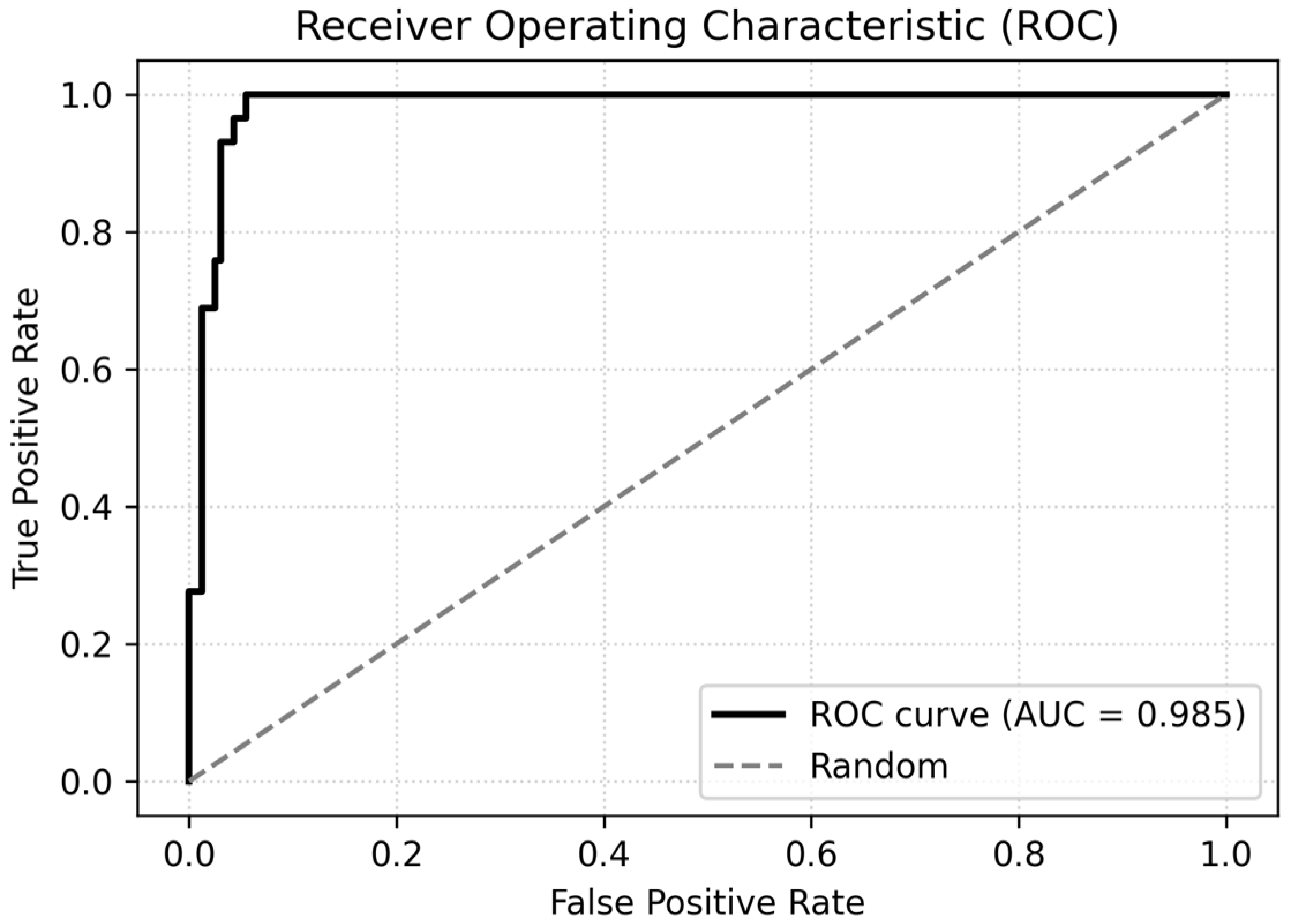 Model calibration was assessed using the Hosmer–Lemeshow goodness-of-fit test, which showed no evidence of poor fit (χ2 = 2.65, df = 8, p = 0.95). The logistic model also achieved good discrimination, with a ROC-AUC of 0.985 and an area under the precision–recall curve (PR-AUC) of 0.893. Using a probability threshold of 0.5 yielded an overall accuracy of 93.2%, with perfect sensitivity for MetS (recall for MetS_bin = 1 = 1.00) and high specificity (0.92) in the test set. The discrimination performance of the logistic regression model is illustrated in Figure 7.