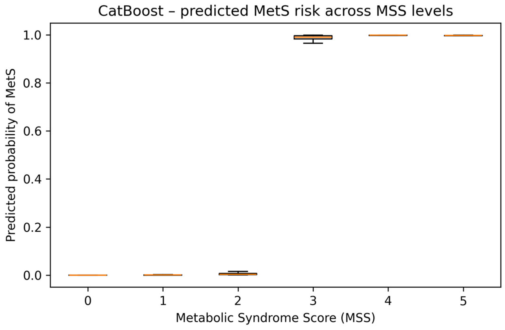 The distribution of CatBoost-predicted MetS probabilities across MSS strata offers an important clinical insight. Individuals with zero, one, or two MetS components had predicted probabilities near zero, whereas those with three to five components approached probabilistic certainty. This indicates that ML models not only replicate the diagnostic boundary defined by international consensus (IDF, AHA/NHLBI, ESH/ESC), but also provide smooth, interpretable transitions across the subclinical spectrum. Such probability estimates may serve as early-warning indicators in clinical practice, especially in individuals not yet meeting full MetS criteria, but already exhibiting clustered metabolic abnormalities.