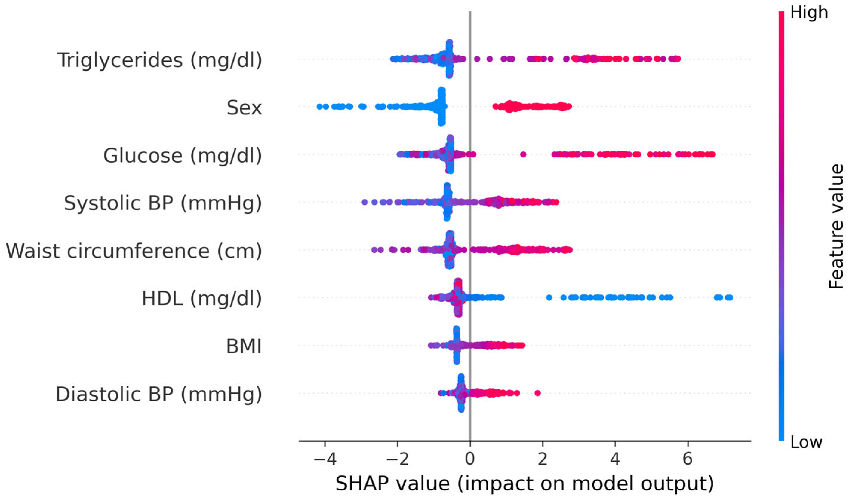 Taken together, these findings show that routinely collected anthropometric, lipid, and glucose-regulation parameters are sufficient to build highly accurate predictive models of metabolic syndrome. The consistency between classical regression results, machine learning predictions, and SHAP-based explainability strongly supports the use of integrated statistical–ML pipelines in future preventive strategies, risk stratification frameworks, and population-level metabolic health assessments.