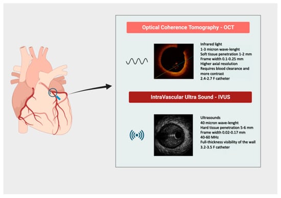 Nevertheless, they are significantly different from a technical point of view due to distinctive physical characteristics: IVUS uses ultrasound (40 µm axial resolution at 40–60 MHz) with great tissue penetration and visualization of vessel structure, but with lower resolution when compared to OCT. Indeed, OCT uses infrared light (1–3-micron wavelength, corresponding to 1300 nm) with lower tissue penetration but higher resolution and consequent higher clarity [axial resolution (10–20 µm) and tissue penetration (~1–2 mm)] [1,2] (Table 1, Figure 1).