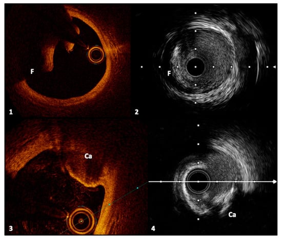 Frames 1 and 2, respectively, with OCT and IVUS, represent an intimal dissection flap with a false lumen. Frames 3 and 4 show a calcified nodule, described, respectively, with OCT and IVUS, characterized by signal-poor regions and acoustic shadowing. Legend: F, flap; Ca, calcified nodule. Pullback speed of automated 1 mm/s for IVUS and 20 mm/s for OCT. IVUS frame rate of 30 frames/s and 150 frames/s for OCT.
