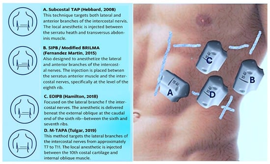 - Güngör, H.; Ciftci, B.; Alver, S.; Gölboyu, B.E.; Ozdenkaya, Y.; Tulgar, S. Modified thoracoabdominal nerve block through perichondrial approach (M-TAPA) vs local infiltration for pain management after laparoscopic cholecystectomy surgery: A randomized study. J. Anesth. 2023, 37, 254–260. [Google Scholar] [CrossRef]