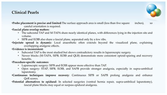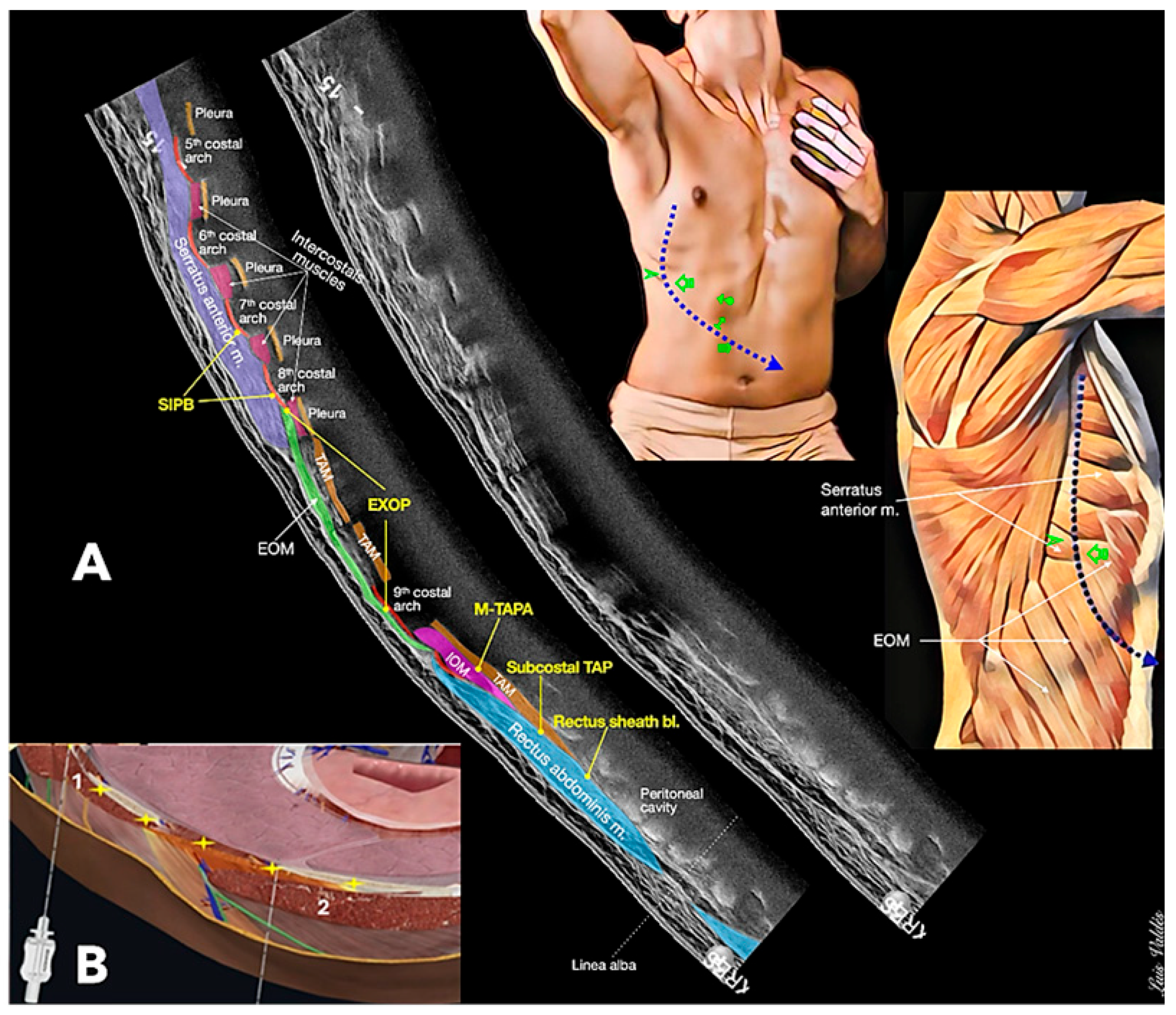 - Ciftci, B.; Alver, S.; Gölboyu, B.E.; Haksal, M.C.; Tulgar, S.; De Cassai, A.; Alici, H.A. A Comparison of Two Fascial Plane Blocks for Abdominal Analgesia in Laparoscopic Cholecystectomy Surgery (M-TAPA vs. External Oblique Intercostal Plane Block): A Prospective Randomized Study. J. Clin. Med. 2025, 14, 3050. [Google Scholar] [CrossRef]