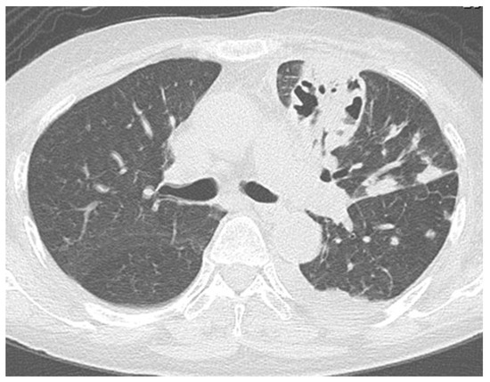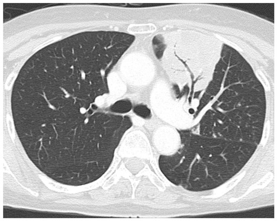 Computed tomography (CT) of the chest demonstrating infiltrative shadow at the left upper lobe, suggesting fungal infection.
